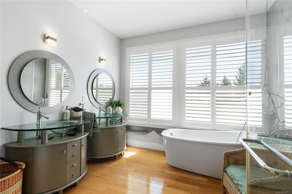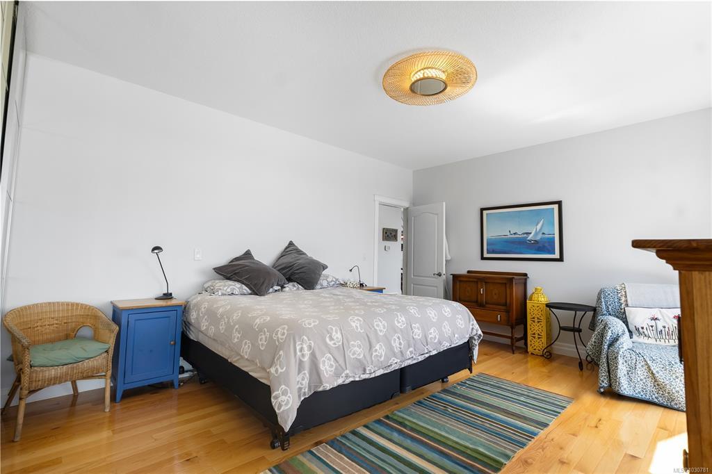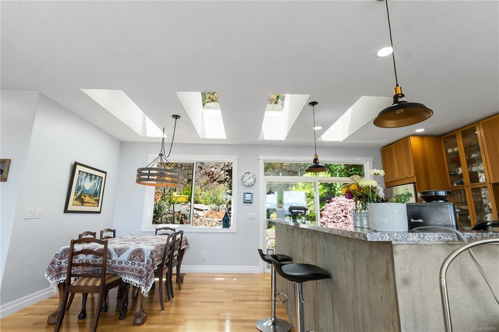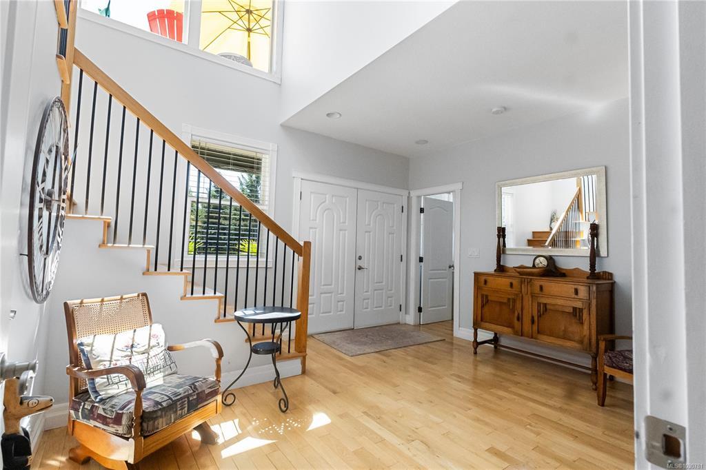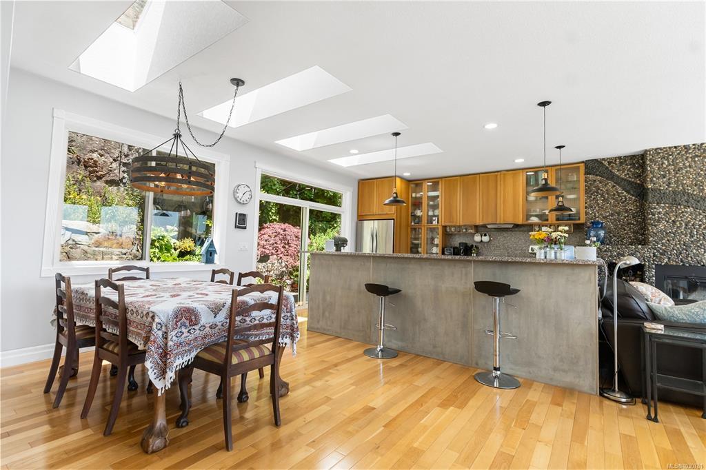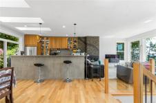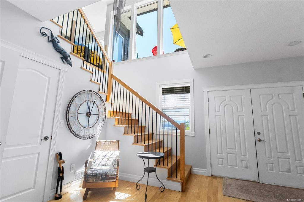 STUNNING OCEAN & MOUNTAIN VIEWS! This immaculate executive residence overlooks Departure Bay & features panoramic vistas and natural light. The gourmet kitchen offers oak cabinetry, granite counters, and a functional layout, while the elegant dining room with skylights opens to a rear patio. A cozy wood-burning fireplace and access to a south-facing deck highlight the living room. The spacious primary suite has a luxurious 5-pce ensuite & generous wardrobe. A 2nd bedroom with private patio and modern main bath complete the main floor. Downstairs features a vaulted entry, den, laundry room, and a beautifully appointed IN-LAW or GUEST SUITE with ensuite, kitchenette, and sitting area. With 2,300 sqft of finished space, composite decking, hardwood floors, and mature landscaping, this home is a rare find. The upper garden with fruit trees, gardens, and a spectacular view towards Vancouver includes a deck which is accessed by spiral staircase. Measurements approx.