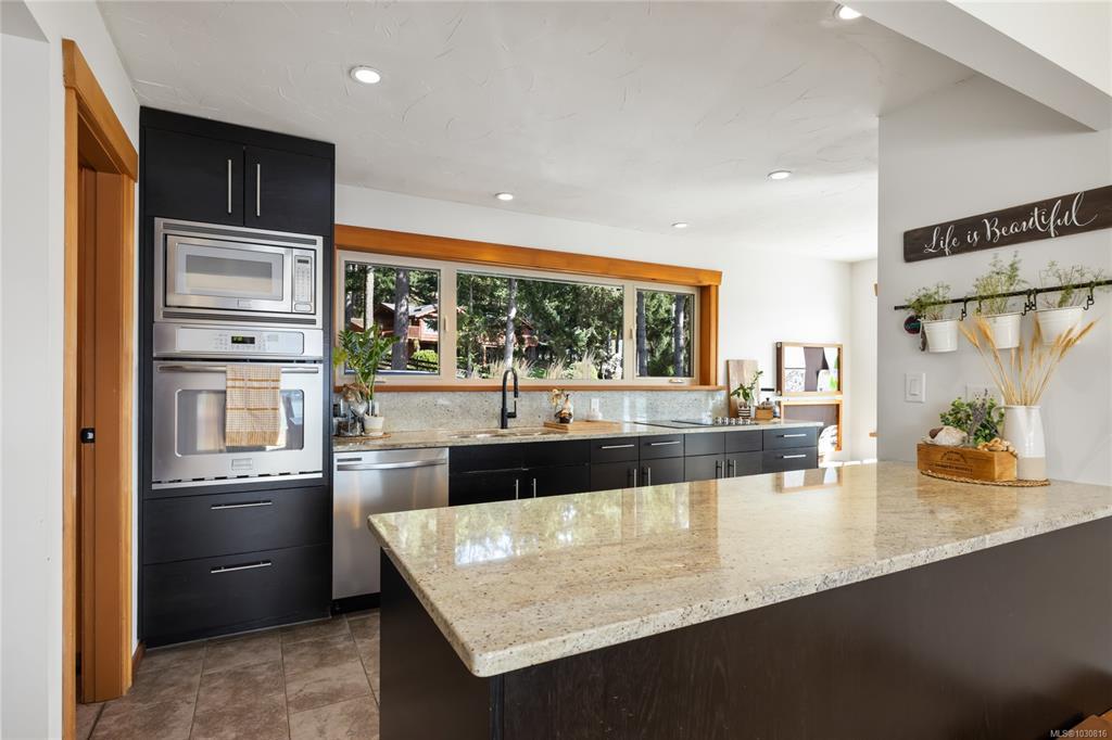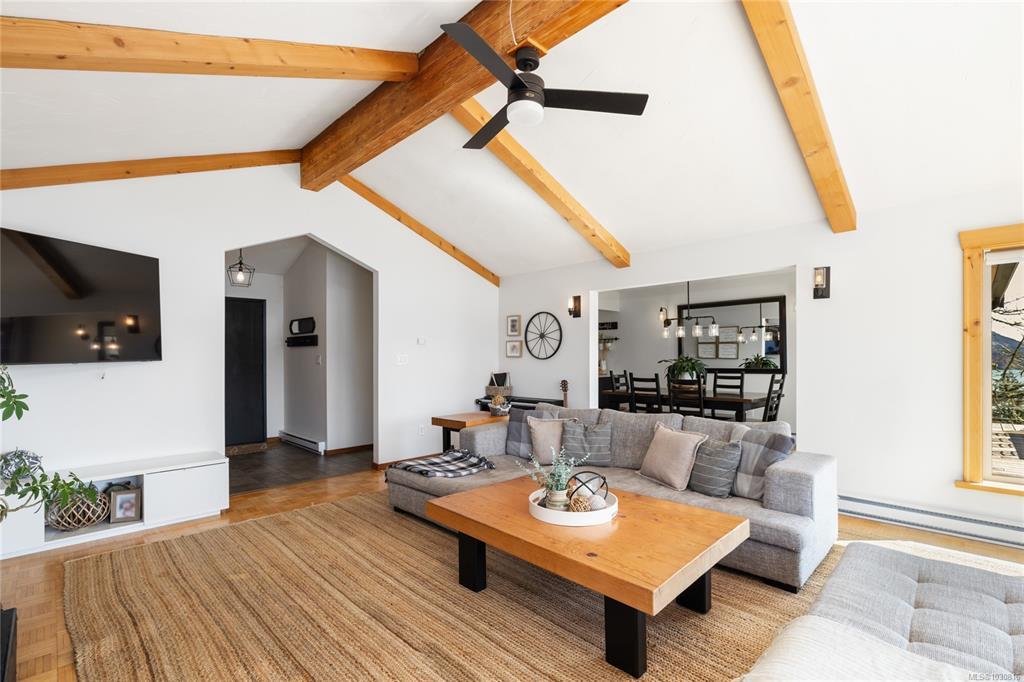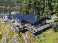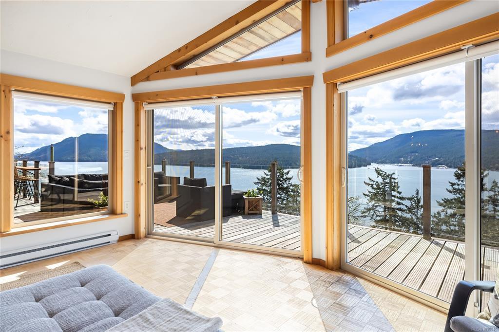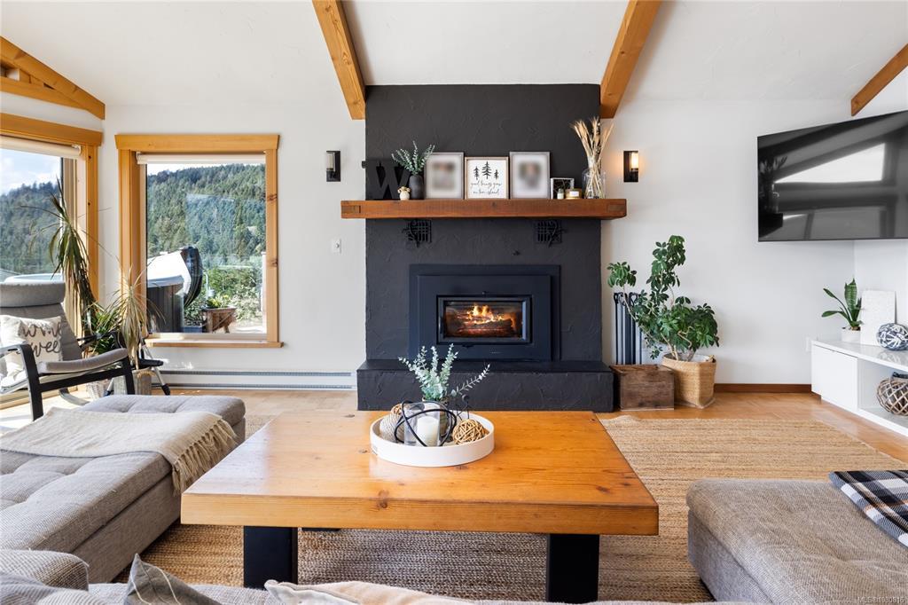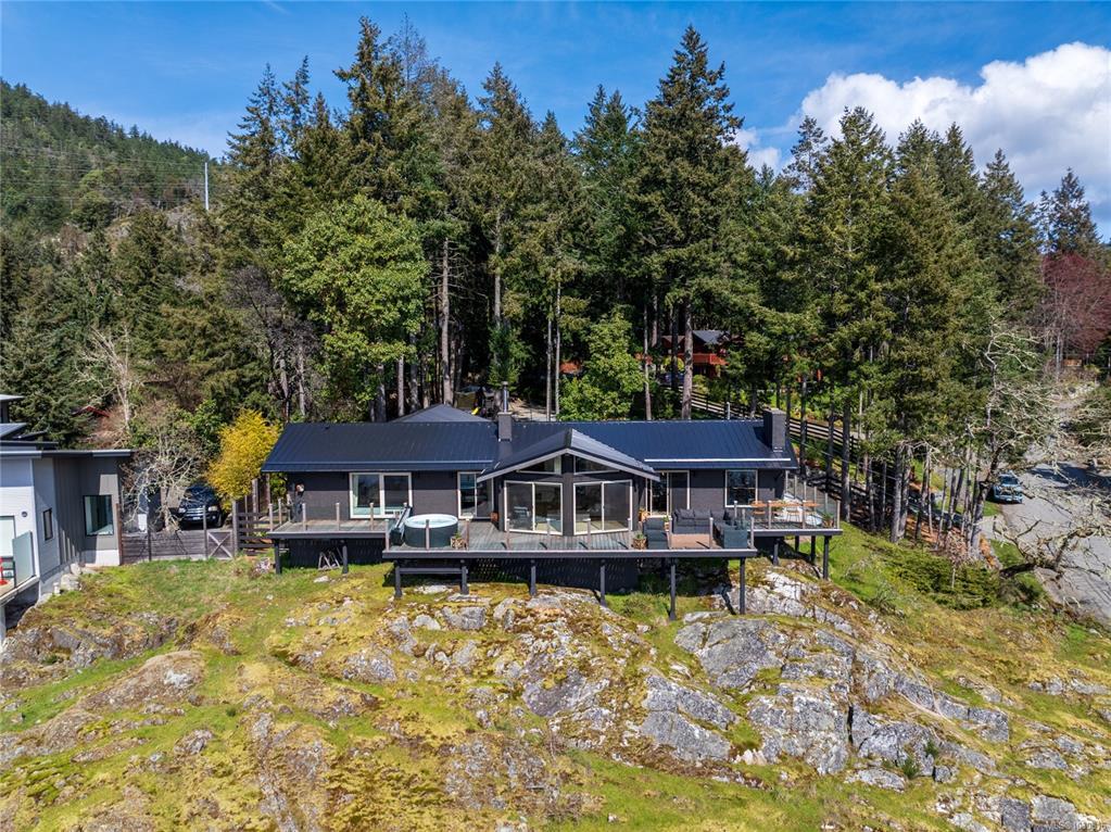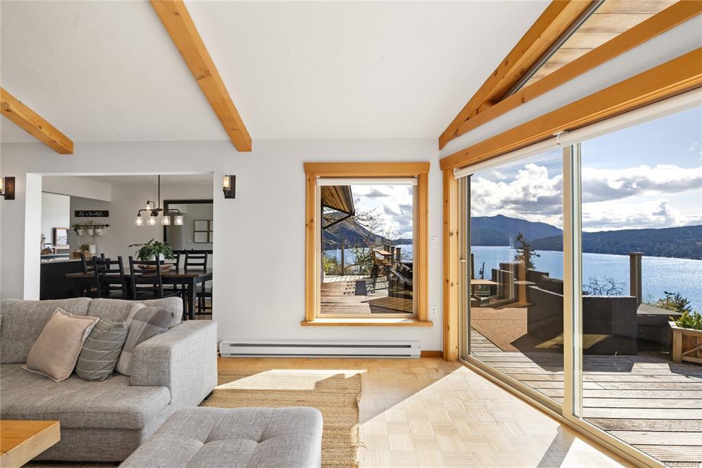 Welcome to 543 Bayview Place / Perched atop a natural rock outcrop in sought-after Maple Bay, this 1,737 sq. ft. oceanview rancher offers breathtaking, uninterrupted southern exposure with panoramic views from sunrise to sunset. Designed for comfortable single-level living, the home features vaulted beamed ceilings, floor-to-ceiling windows, and a bright, airy interior filled with natural light. A wood-burning stove efficiently heats the home, complementing warm wood and tile flooring. The kitchen boasts granite countertops, a walk-in pantry, and flows into a formal dining area ideal for entertaining. The private primary suite is positioned on the west side and enjoys stunning ocean views. Outdoor living shines with a 900+ sq/ft wrap-around deck, hot tub, and a beautifully landscaped 0.80-acre property with mature Fir and Arbutus trees. Complete with a 2-car garage and gated entry, this is West Coast living at its finest.
