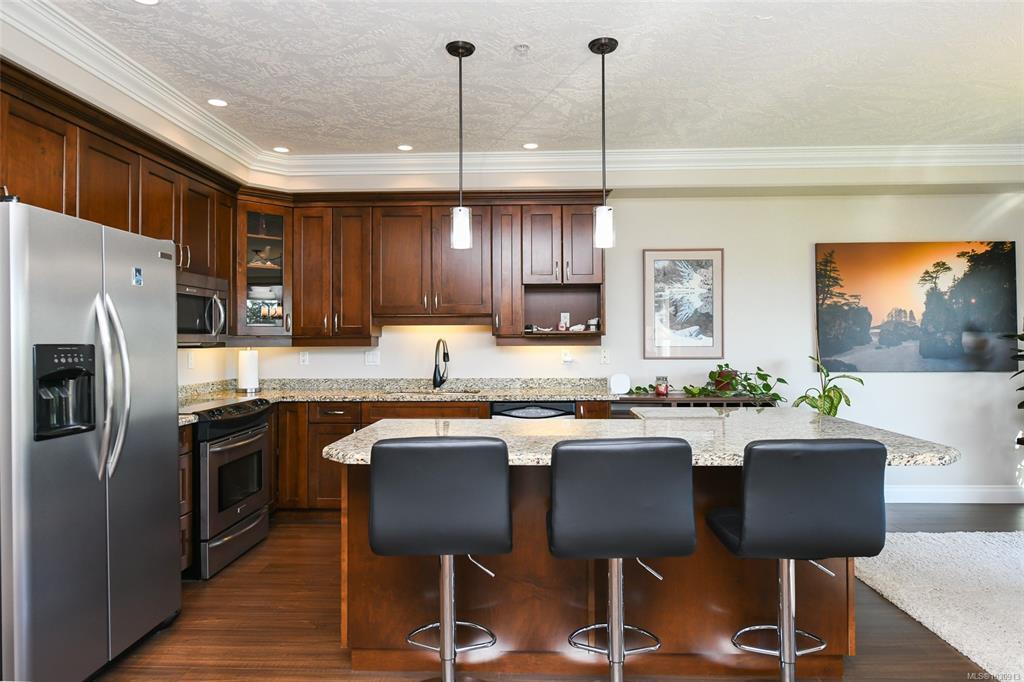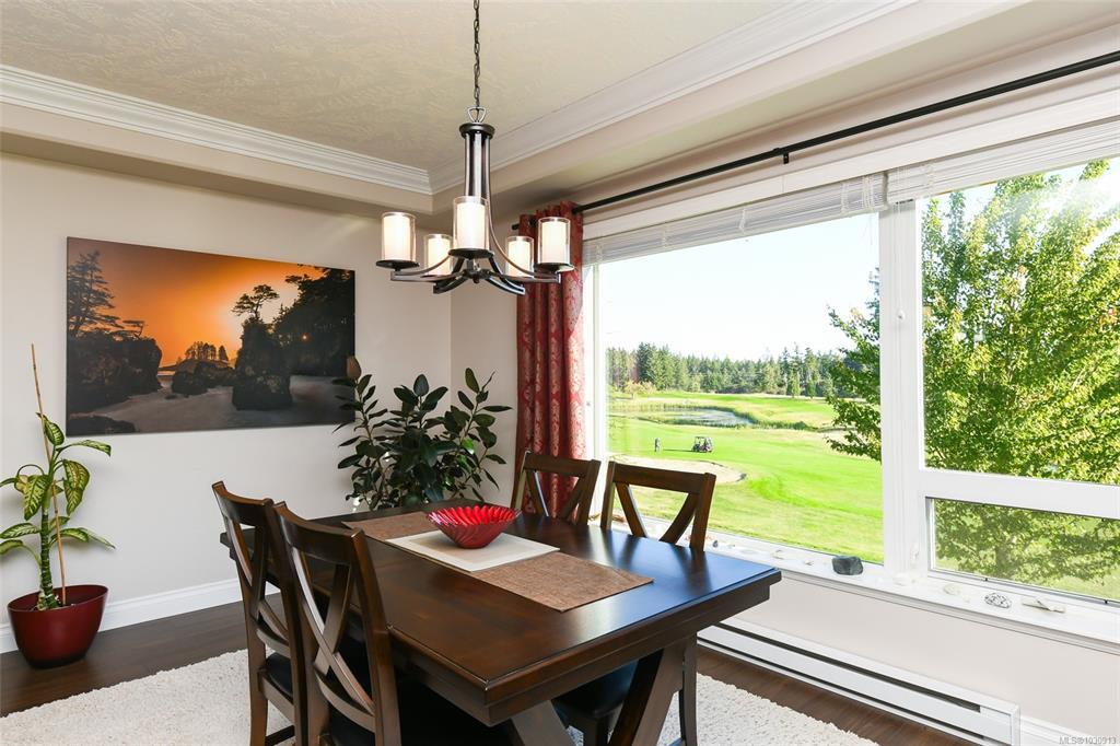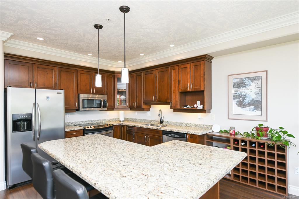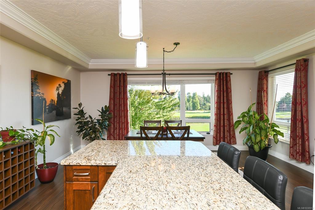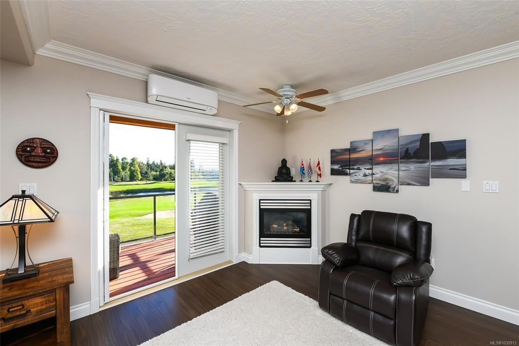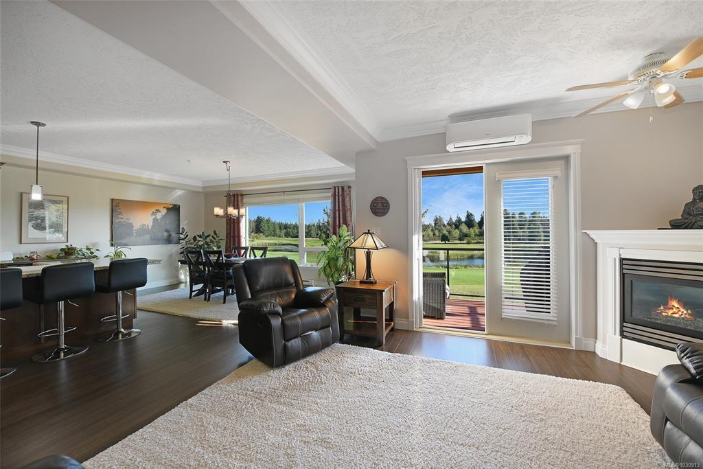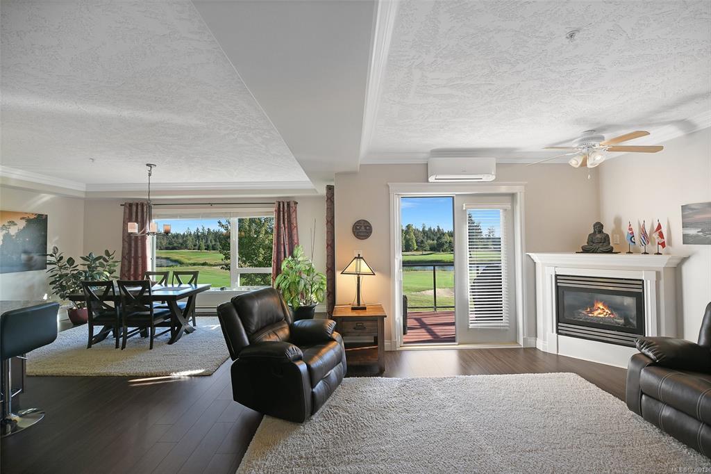 Sunrise and coastal mountain views across the 3rd, 4th & 5th fairways! Enjoy refined living at Corinthia Estates, Crown Isle Golf Resort. This 1753 sq ft corner unit offers 2 beds plus den, 2 baths, and abundant natural light. High-end finishes include commercial-grade laminate, maple shaker cabinets, granite counters, crown moulding, and heated slate tile in the ensuite. The bright kitchen features stainless appliances and a large L-shaped island. The open living space offers a gas fireplace, air conditioning, and access to a covered deck with BBQ hookup. The spacious primary has a large closet with the added convenience of stacking laundry, and spa-like ensuite with tiled shower and multi-jets. Secure underground parking, storage locker plus Golf Cart parking! All ages, pets, rentals welcome—see bylaws.