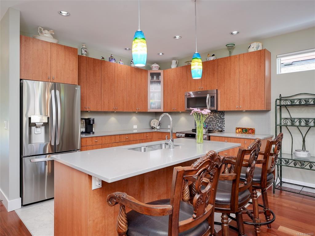 Custom-built for main-level living, this beautifully maintained 13-year-old home shows like new. The bright open-concept kitchen, dining, & living space features gleaming hardwood floors, soaring 18’ ceilings, expansive windows, Hunter Douglas blinds, and state-of-the-art lighting. The well-appointed kitchen offers s/s appliances, an island with a sink, a breakfast bar, and ample pantry storage—perfect for everyday living and entertaining. The main-floor primary suite includes a walk-in closet and a stylish ensuite with a walk-in shower. Upstairs, you’ll find two additional bedrooms, a full bath, and a spacious 20' x 15' recreation room—ideal for a home office, gym, or media space. Enjoy year-round comfort with a heat pump and HVAC system. The fully fenced backyard boasts tidy gardens and a large patio for outdoor living. Complete with a large single garage, a double driveway, off-street visitor parking, and a central location—this home checks all the boxes! Strata for private road.