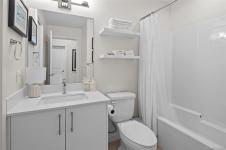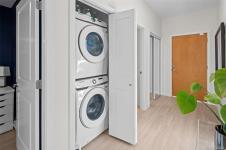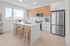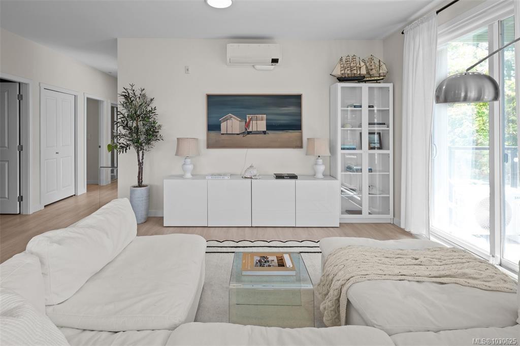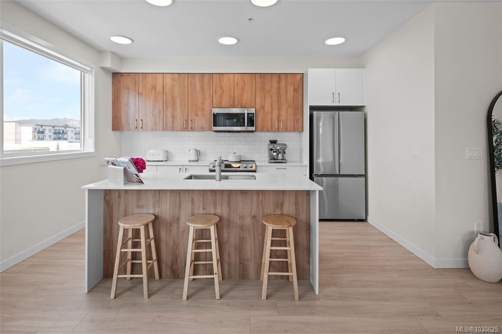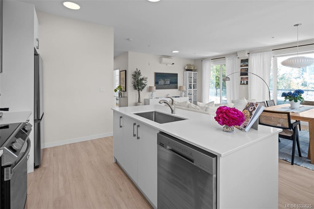 Experience exceptional space and natural light in this generous 916 sq ft 1 bed + den CORNER UNIT. Thoughtfully designed with modern, tasteful finishes, it features oversized south-facing windows and an open living/dining layout with room for full furniture sets. The stylish, functional kitchen offers two-tone cabinets, quartz counters, s/s appliances, and a large island—great for daily use or entertaining. Enjoy 9-ft ceilings, A/C (heat pump), in-suite laundry, and a spacious balcony. Located in a prime Westshore spot steps to the lake, shopping, gyms, and top amenities. The secure, pet- and rental-friendly building includes a fitness centre, BBQ terrace, gated parking, a storage locker, and a bike room. As a newer build with no GST, it’s a smart, standout investment. Book your private showing today!