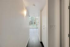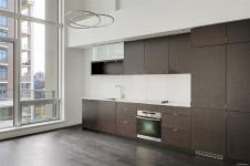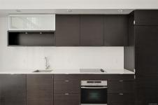 Rich dark hardwood floors and sleek matching kitchen cabinetry create a modern, sophisticated feel, while the carpeted upper loft and heated tile floors in the bathroom add warmth and comfort. The open-concept kitchen is designed to impress, complete with stainless steel appliances, a hidden cabinet-front fridge.