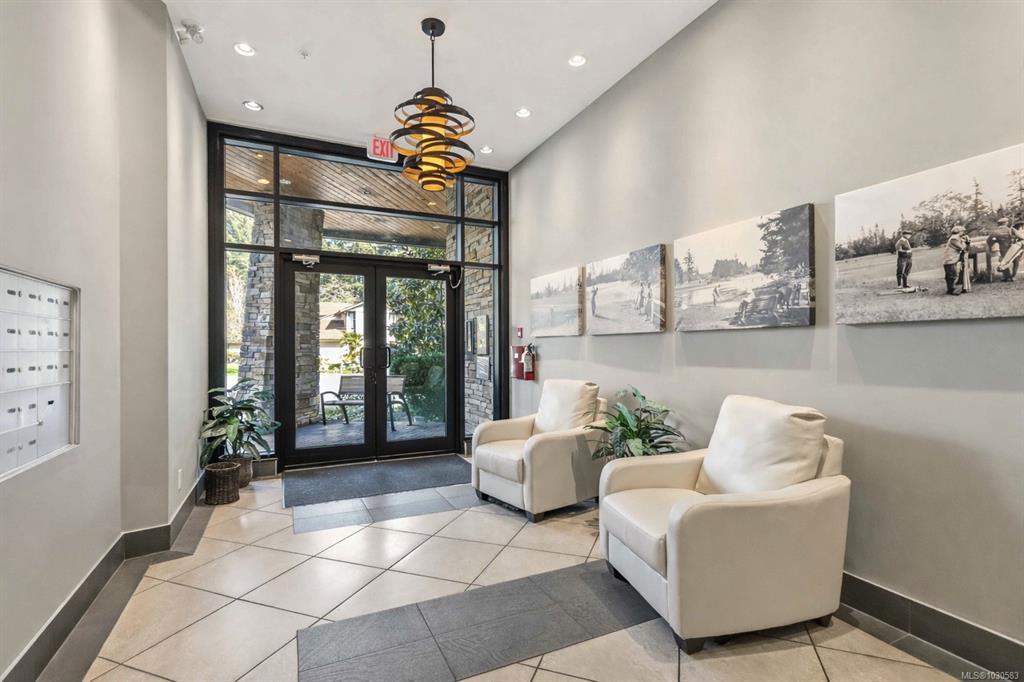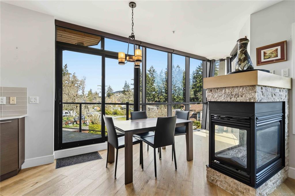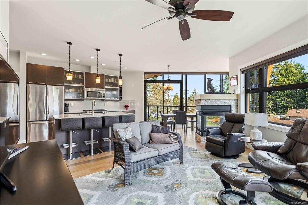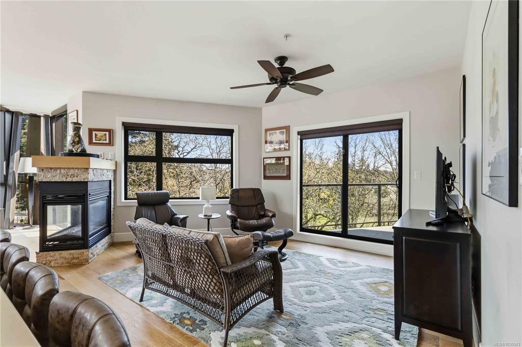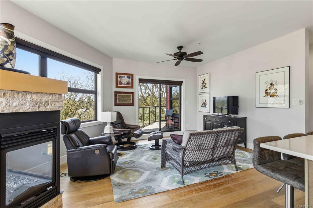 Introducing “The Tree House” a beautifully designed residence tucked away at the end of a quiet cul-de-sac. This southeast-facing corner unit sits along the Royal Colwood Golf Course, with expansive views & natural light through floor-to-ceiling windows. Thoughtfully laid out, this home features 2 spacious beds, 2 baths & 2 sundecks, ideal for relaxing or entertaining. The open living space is enhanced by 9-ft. ceilings, engineered hardwood floors & a stunning three-sided gas fireplace with a stone surround. The kitchen features sleek quartz countertops, SS appliances including a wine fridge, seamlessly connecting to the living & dining areas. The large primary suite includes a WIC & a 5-piece ensuite. Features include heated floors, gas hot water on demand, a heat pump with AC, BBQ hookup & pet-friendly living. One covered parking stall and storage locker included. All of this just a short stroll to the shops, dining & everyday conveniences of charming Goldstream Village.
