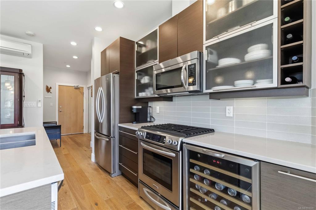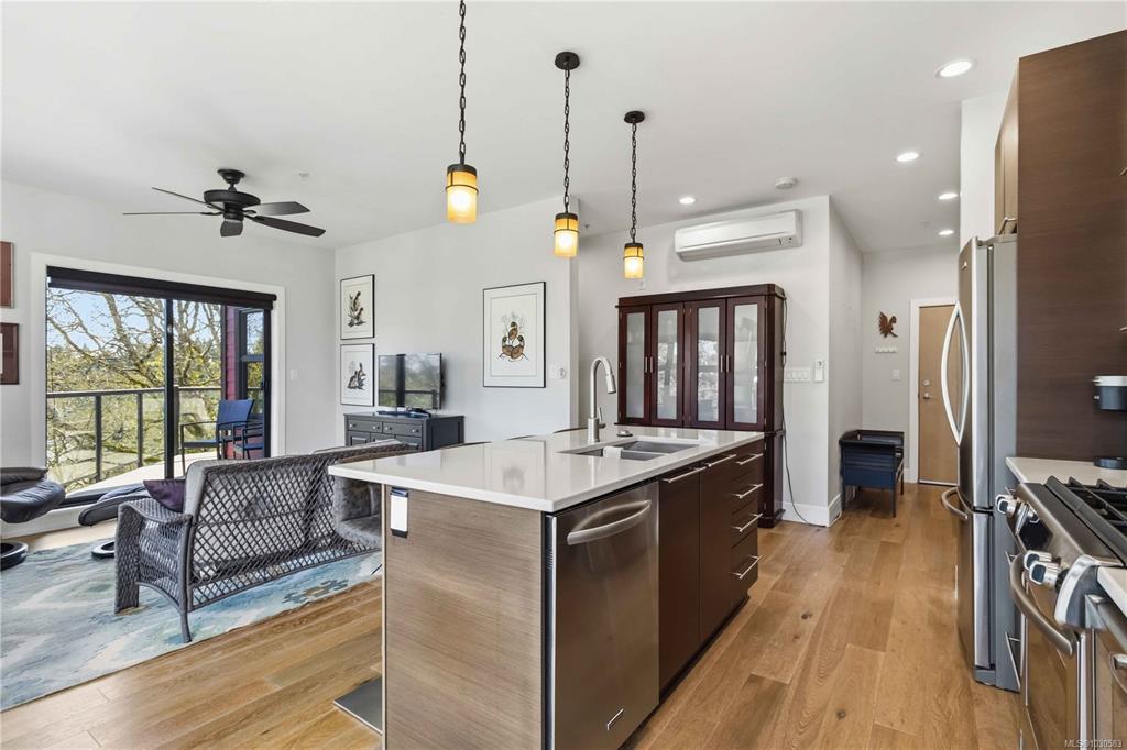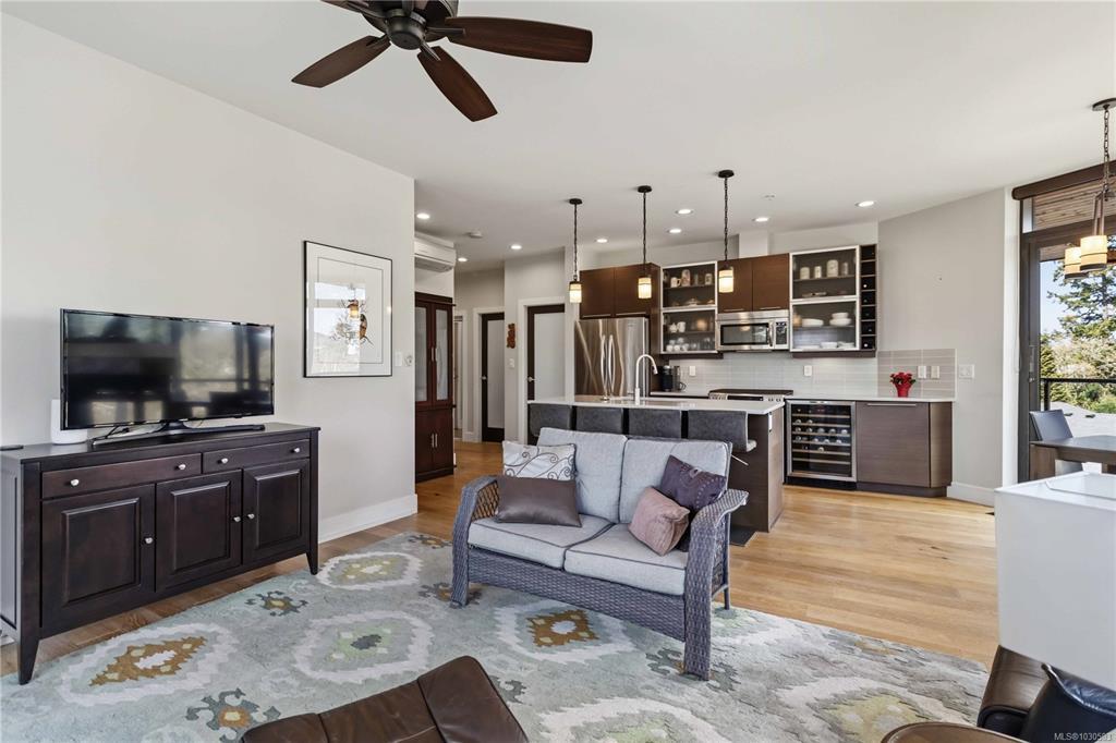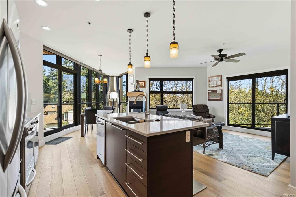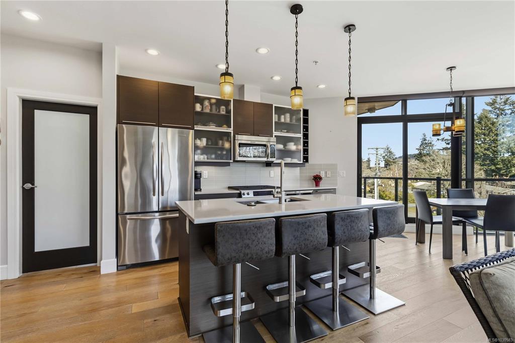 Introducing “The Tree House” a beautifully designed residence tucked away at the end of a quiet cul-de-sac. This southeast-facing corner unit sits along the Royal Colwood Golf Course, with expansive views & natural light through floor-to-ceiling windows. Thoughtfully laid out, this home features 2 spacious beds, 2 baths & 2 sundecks, ideal for relaxing or entertaining. The open living space is enhanced by 9-ft. ceilings, engineered hardwood floors & a stunning three-sided gas fireplace with a stone surround. The kitchen features sleek quartz countertops, SS appliances including a wine fridge, seamlessly connecting to the living & dining areas. The large primary suite includes a WIC & a 5-piece ensuite. Features include heated floors, gas hot water on demand, a heat pump with AC, BBQ hookup & pet-friendly living. One covered parking stall and storage locker included. All of this just a short stroll to the shops, dining & everyday conveniences of charming Goldstream Village.