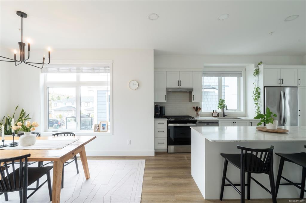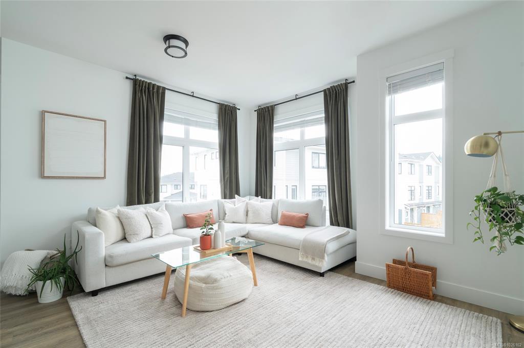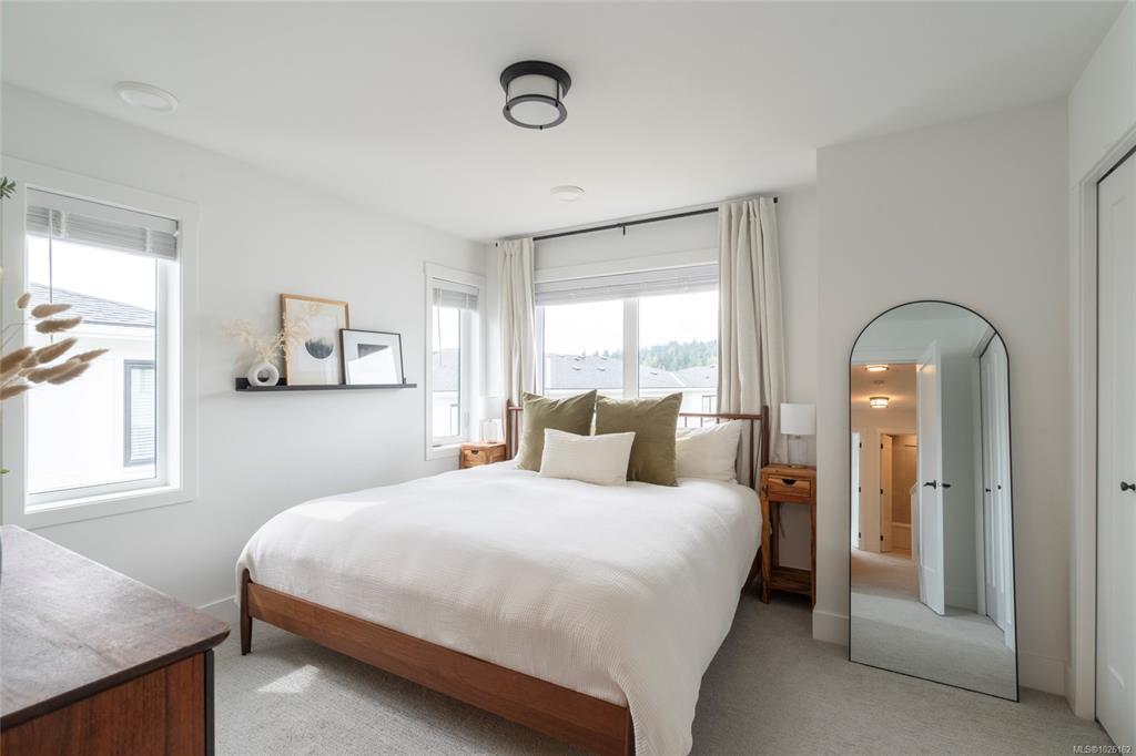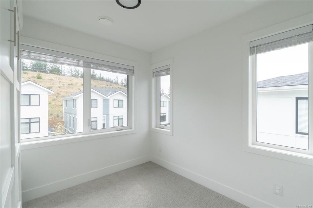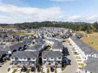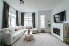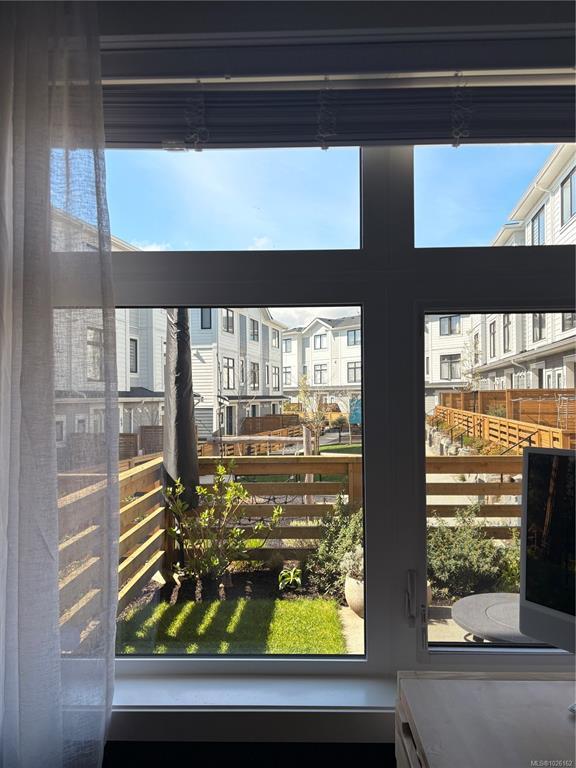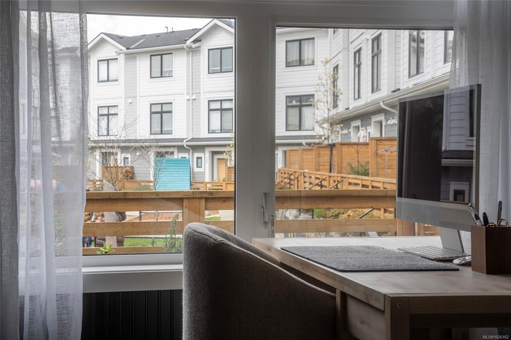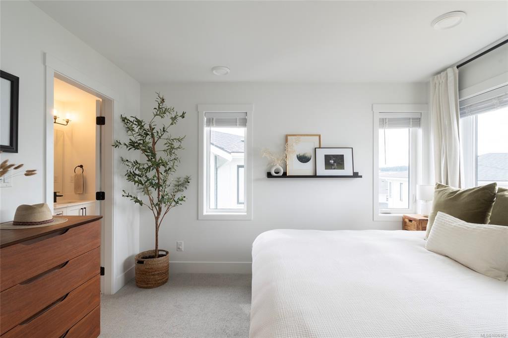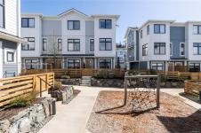 This bright corner unit offering large windows is the most sought-after layout in the complex. This 3-storey corner townhome offers 3 bedrooms plus a den and is ideally positioned facing the park with direct walk-up entry. The ground level features a spacious garage & versatile den—perfect for a home office, gym, or guest space—with convenient park access. West-facing entry and patio space offer a great spot to enjoy afternoon & evening sun.Upstairs, the 2nd level opens into a bright, expansive living space where the kitchen, dining, & living areas flow together, anchored by an oversized quartz island that is perfect for everyday living & hosting. Thoughtful upgrades include quartz countertops throughout, black hardware, & custom built-in electric fireplace. A front deck extends the living space outdoors. Upstairs offers three well-sized bedrooms, including a primary with heated ensuite floors. Located in a quiet pocket of Royal Bay, just minutes to the beach, parks, schools, amenities