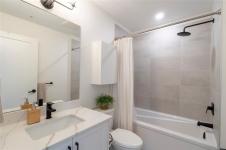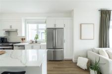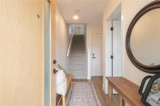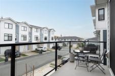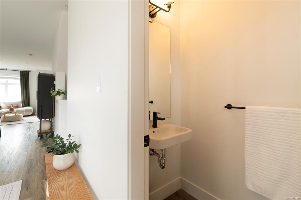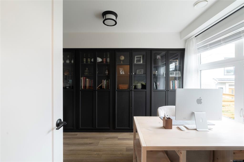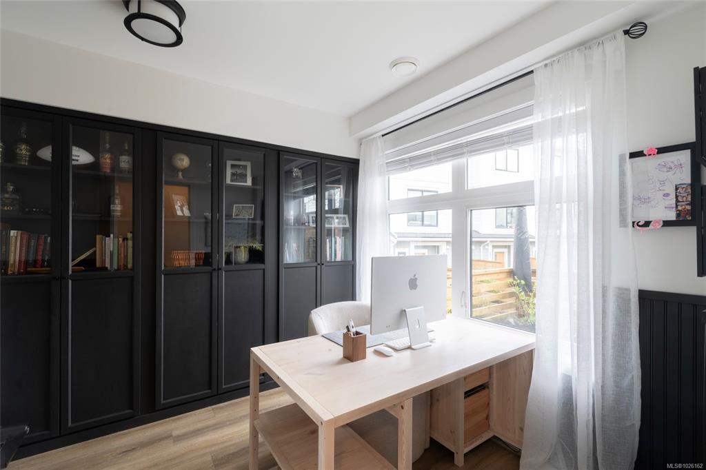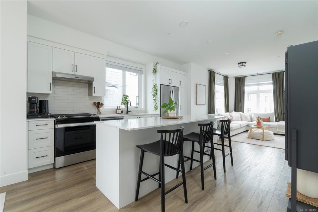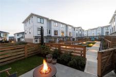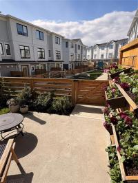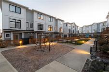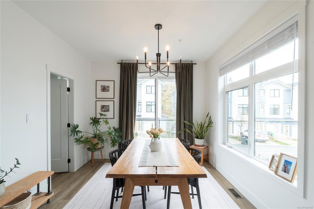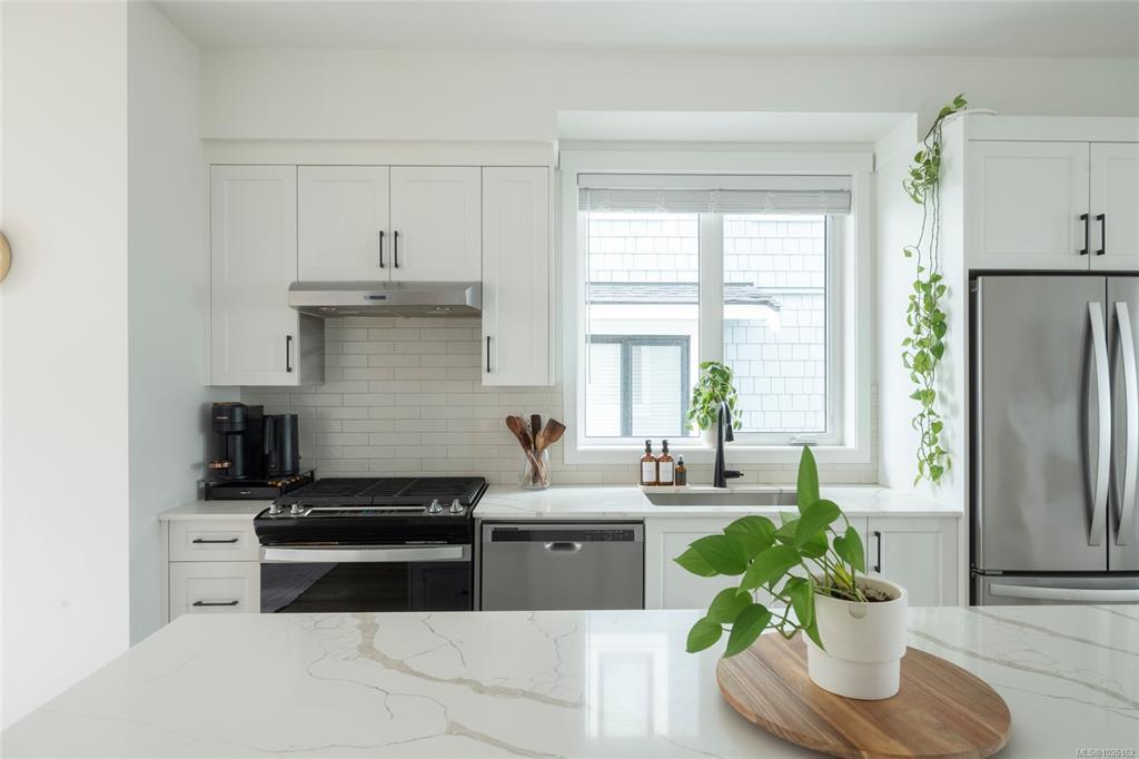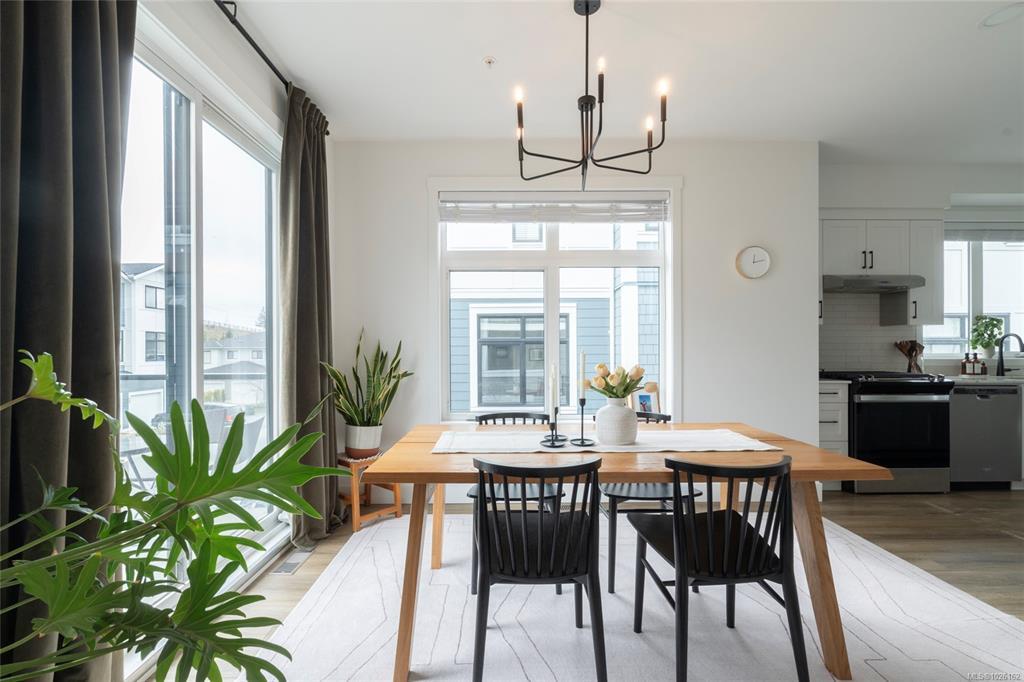 This bright corner unit offering large windows is the most sought-after layout in the complex. This 3-storey corner townhome offers 3 bedrooms plus a den and is ideally positioned facing the park with direct walk-up entry. The ground level features a spacious garage & versatile den—perfect for a home office, gym, or guest space—with convenient park access. West-facing entry and patio space offer a great spot to enjoy afternoon & evening sun.Upstairs, the 2nd level opens into a bright, expansive living space where the kitchen, dining, & living areas flow together, anchored by an oversized quartz island that is perfect for everyday living & hosting. Thoughtful upgrades include quartz countertops throughout, black hardware, & custom built-in electric fireplace. A front deck extends the living space outdoors. Upstairs offers three well-sized bedrooms, including a primary with heated ensuite floors. Located in a quiet pocket of Royal Bay, just minutes to the beach, parks, schools, amenities