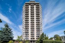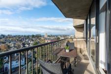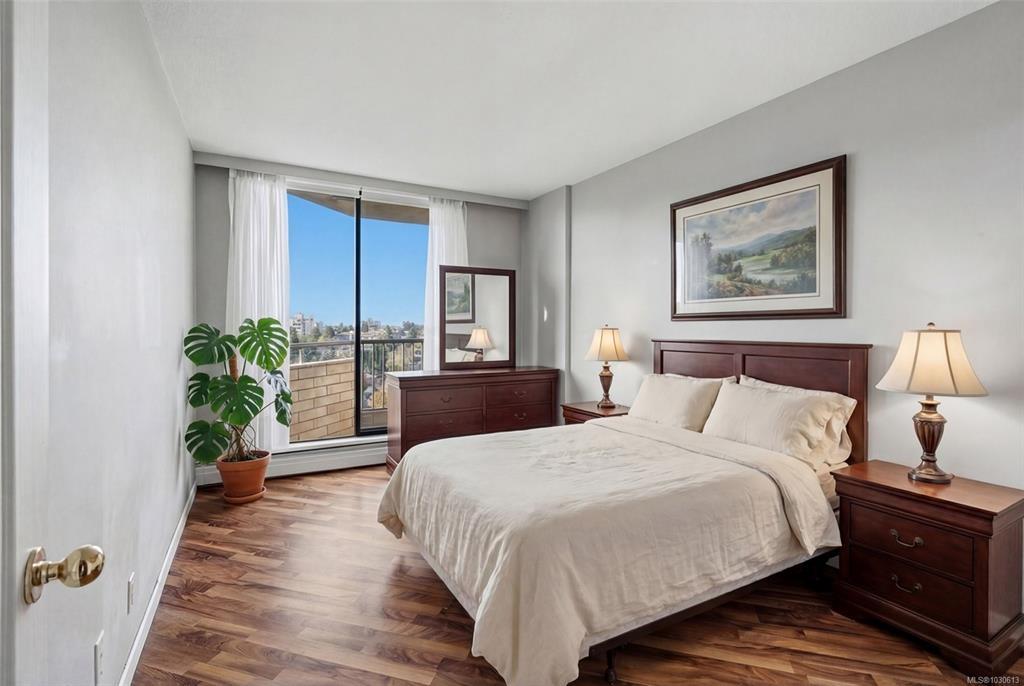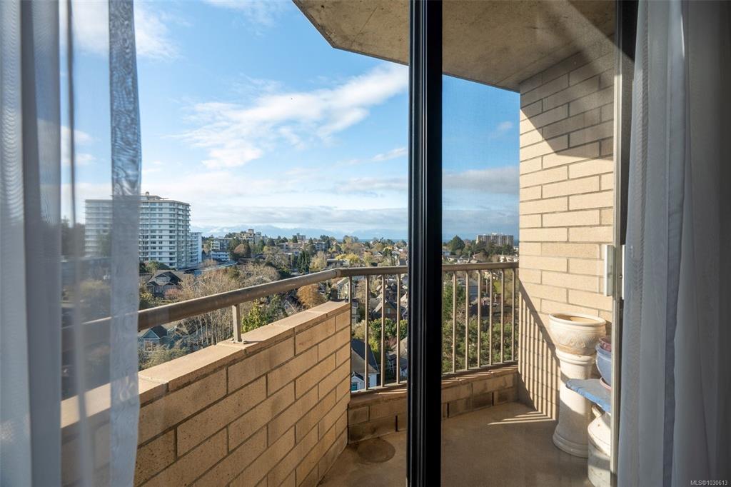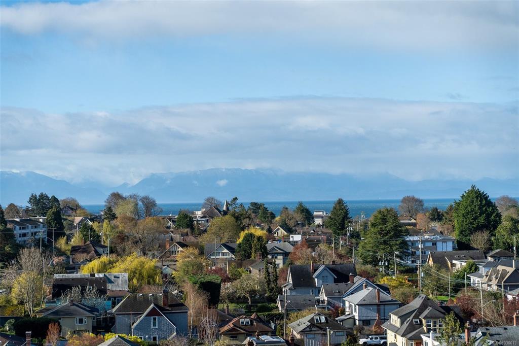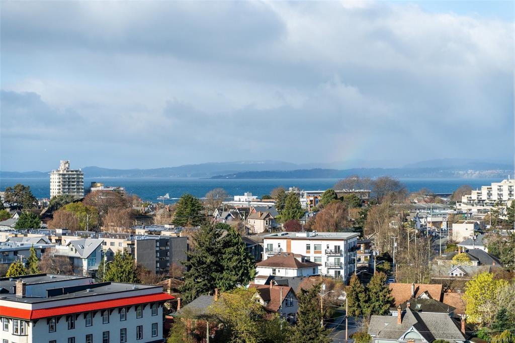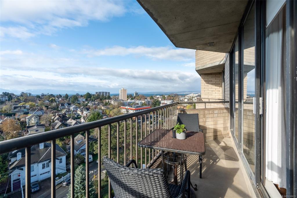 High above the coastline, this 10th floor south facing 2 bedroom, 1 bathroom condo captures stunning panoramic views of the Salish Sea and Olympic Mountains in sought after James Bay. Enjoy two private balconies, ideal for morning coffee or evening sunsets. Inside, the bright functional layout features a charming kitchen and bathroom, and laminate flooring throughout for a clean low maintenance feel. Thoughtful features include an accessible tub, closet organizers, and custom blackout drapes for added comfort. Located in Roberts House, a well managed steel and concrete building with pool, hot tub, fitness room and guest suites. Steps to Beacon Hill Park, Dallas Road waterfront and downtown. Secure underground parking, storage, heat and hot water included. Pet friendly with rentals allowed. The ONLY 2 bedroom unit currently available in the building!