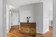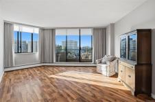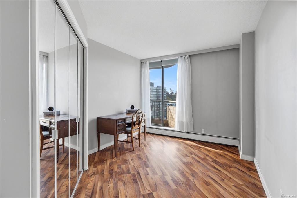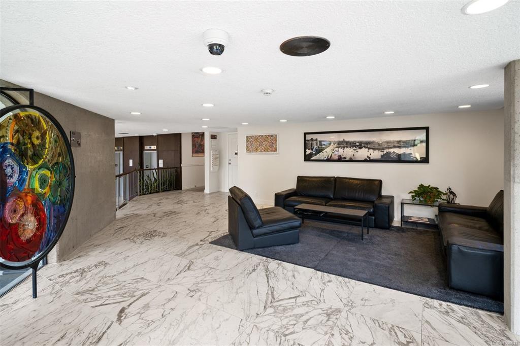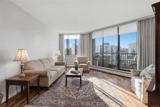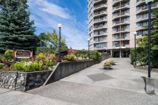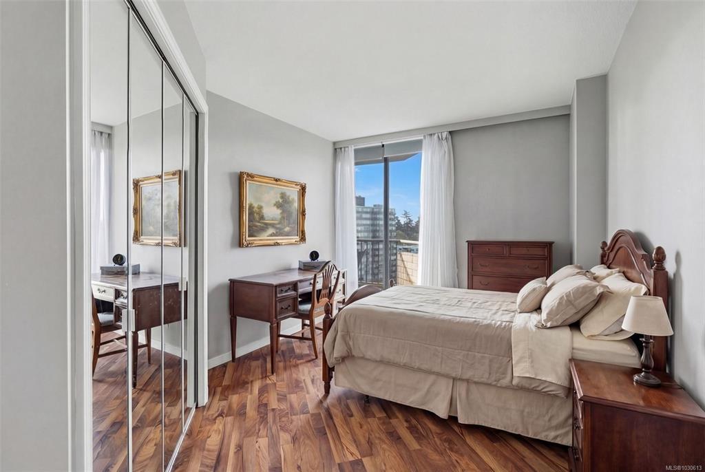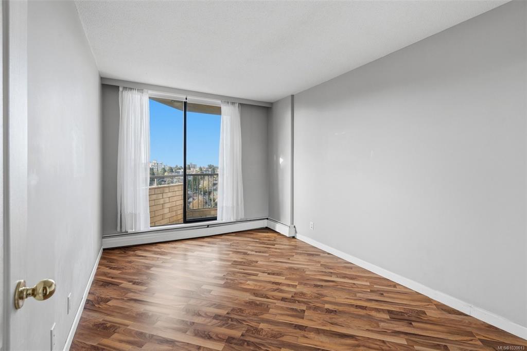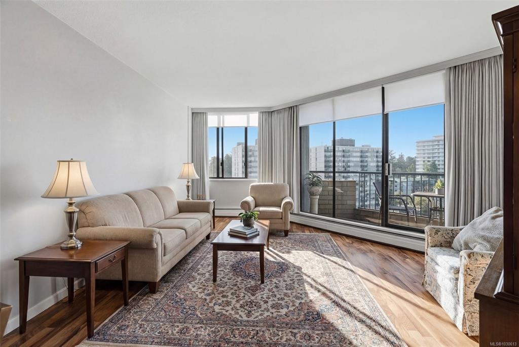 High above the coastline, this 10th floor south facing 2 bedroom, 1 bathroom condo captures stunning panoramic views of the Salish Sea and Olympic Mountains in sought after James Bay. Enjoy two private balconies, ideal for morning coffee or evening sunsets. Inside, the bright functional layout features a charming kitchen and bathroom, and laminate flooring throughout for a clean low maintenance feel. Thoughtful features include an accessible tub, closet organizers, and custom blackout drapes for added comfort. Located in Roberts House, a well managed steel and concrete building with pool, hot tub, fitness room and guest suites. Steps to Beacon Hill Park, Dallas Road waterfront and downtown. Secure underground parking, storage, heat and hot water included. Pet friendly with rentals allowed. The ONLY 2 bedroom unit currently available in the building!