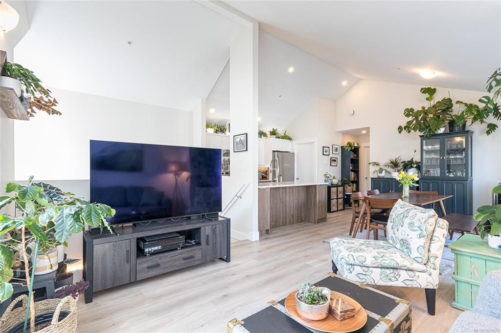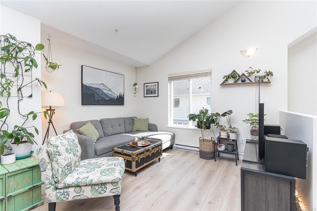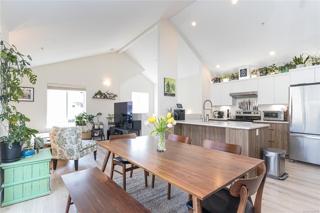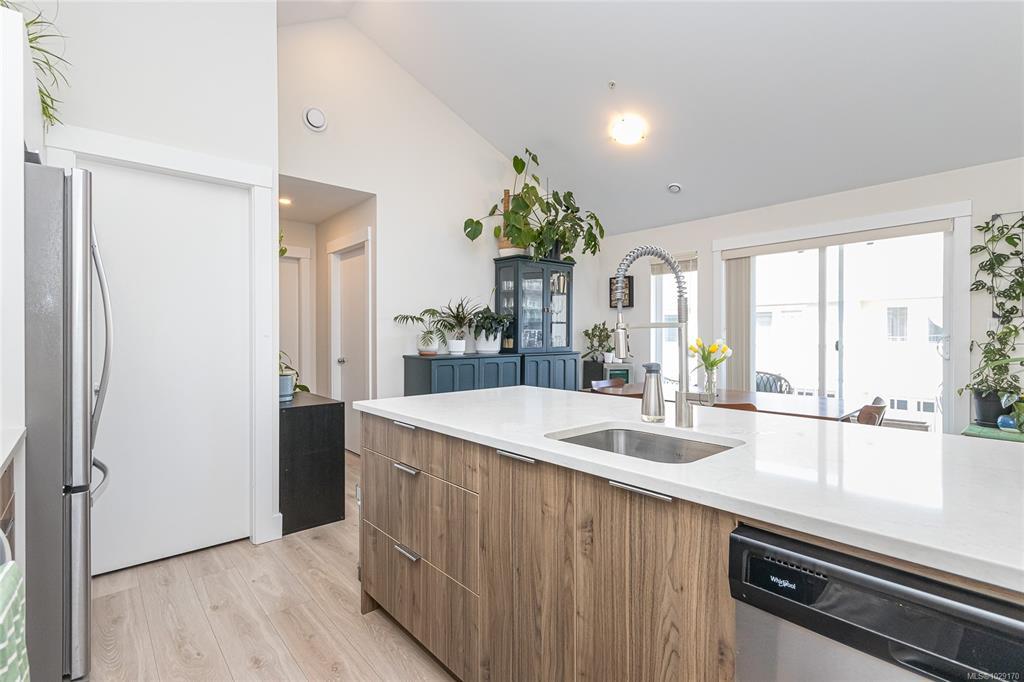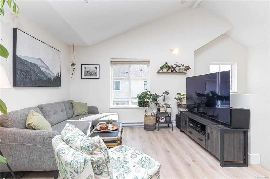 Step into this fantastic one-bedroom townhouse in a quiet residential neighborhood in Sooke Village. The spacious open-concept floor plan features a modern kitchen with two-toned cabinets, quartz countertops, stainless steel appliances, and a breakfast bar. Large windows fill the home with natural light, highlighting vaulted ceilings, separate living and dining areas, and a private balcony perfect for relaxing or entertaining. The generously sized bedroom accommodates a king bed and offers direct access to a large bathroom with a substantial closet. Additional highlights include in-suite laundry, a pantry, quality flooring, an open stairwell, ample storage, and an attached private garage. This well-managed strata allows children, pets, and rentals. Centrally located, you’re steps from the municipal trail system, a short stroll to the ocean, or the vibrant village center with the beloved Stick in the Mud Coffeehouse, Sooke Brewing Co., restaurants.