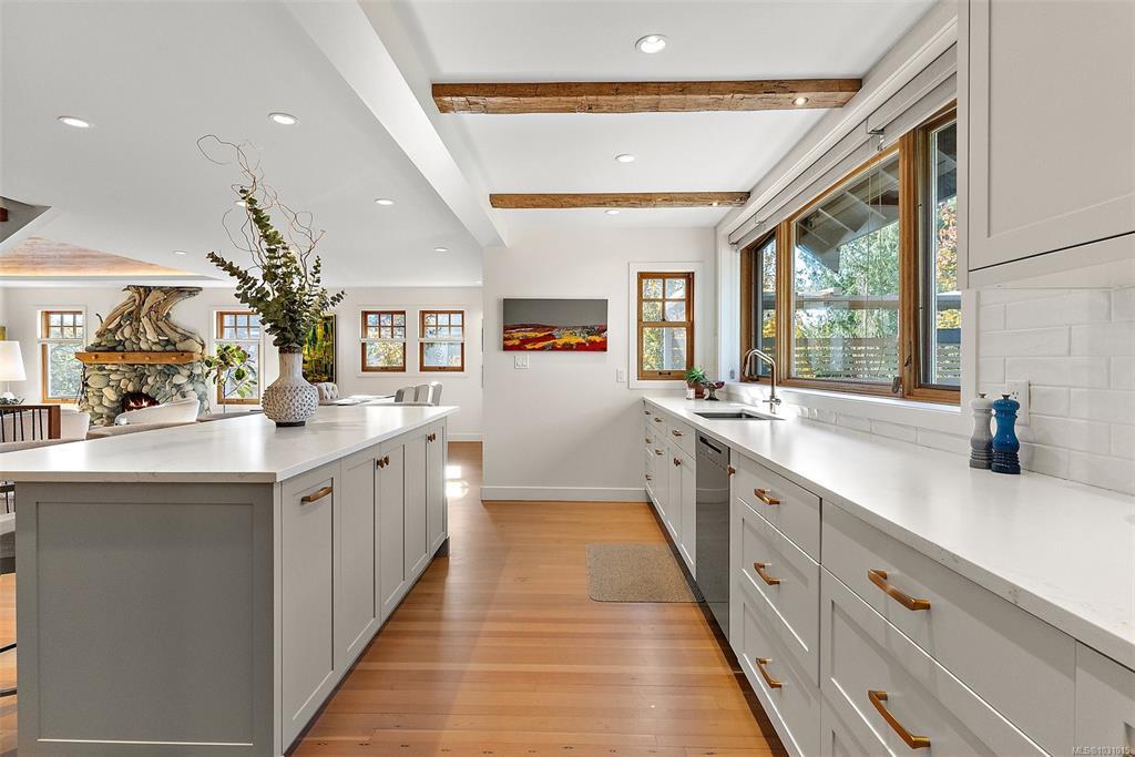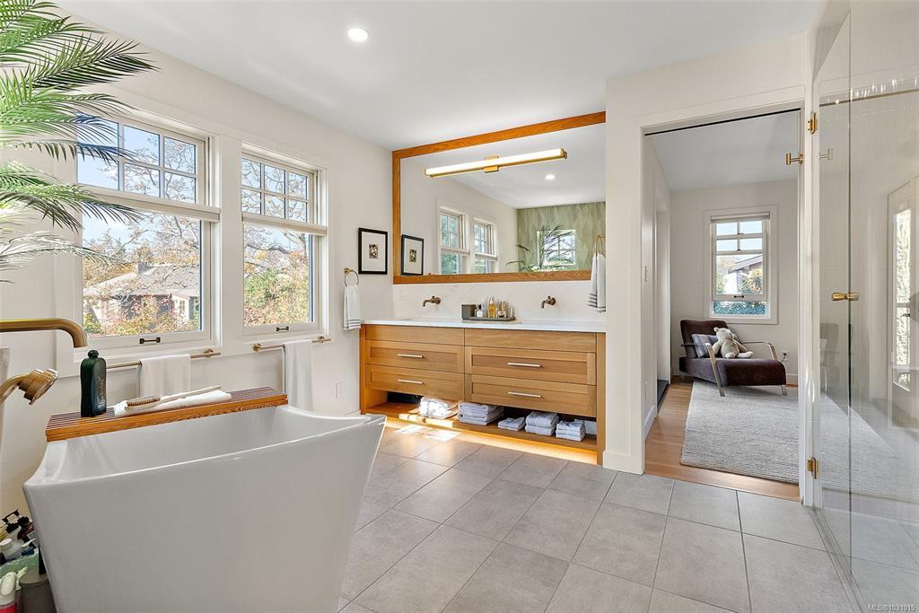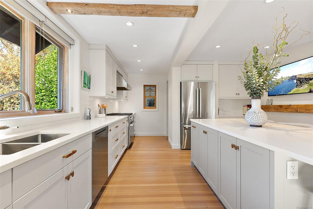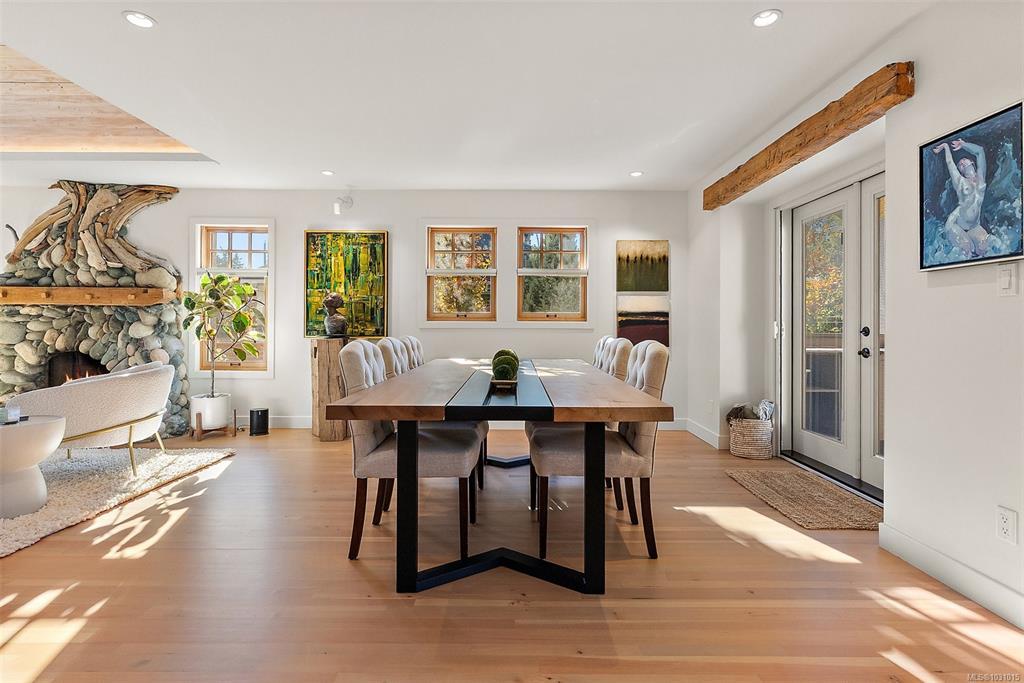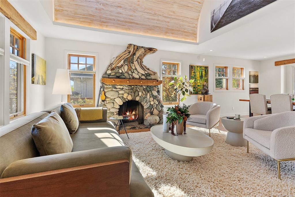 Gorgeous executive home in coveted South Oak Bay, set on a quiet, tree-lined street just steps to the beach. Now offered at a new price, this represents exceptional value for the quality of construction and finishing. Completely reimagined with a no-expense-spared approach, it showcases outstanding craftsmanship throughout, including a custom fireplace by Eckerman Studios, 200-year-old Pennsylvania oak beams, a barrel-vaulted ceiling, and a striking staircase of Haida Gwaii cedar. The main level offers bright, open living and a chef’s kitchen with premium Miele appliances, flowing to a west-facing backyard with heated outdoor dining, deck, hot tub, and a beautifully landscaped garden just coming into bloom. Extensive 2022 upgrades include electrical, hot water on demand, radiant in-floor heating, and A/C in the primary. Serene top-floor primary retreat with spa bath, walk-in closet, and private deck. Lower level with media room, bedrooms, wine room and storage.