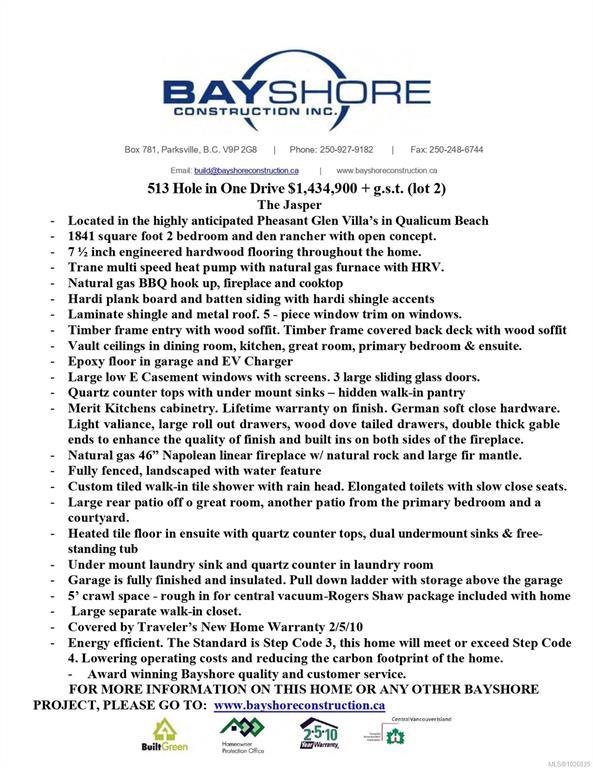 Experience refined West Coast living in this 2 bedroom plus den (or 3rd bed), 3 bath villa offering 2,126 sq ft of thoughtfully designed space, built by Bayshore Construction. The Jasper plan features vaulted ceilings in the kitchen, dining, and living areas, creating a bright, open-concept layout ideal for everyday living and entertaining. The kitchen is anchored by a large island, with quartz countertops, engineered hardwood, and a walk-in pantry adding both style and function. Dual sliding glass walls open to both front and rear patios for seamless indoor-outdoor living and sun exposure any time of day. The primary suite offers a beautifully appointed ensuite, while the upper-level flex space is perfect for guests, a home office, or media room. Landscaping, appliances, fencing, and irrigation are included. Located in the heart of Qualicum Beach, minutes to shops, cafés, and Pheasant Glen Golf Resort. Low-maintenance, lock-and-leave living. Photos are of a similar villa.