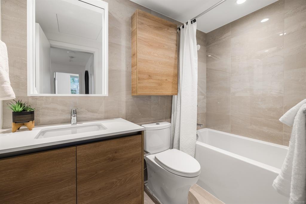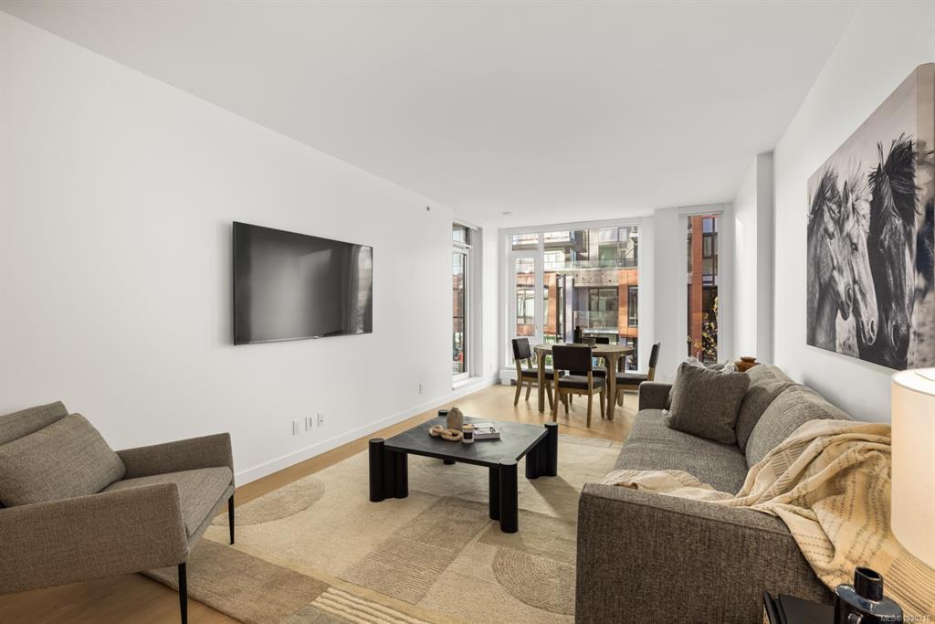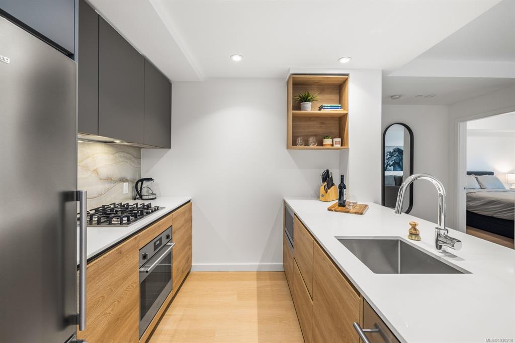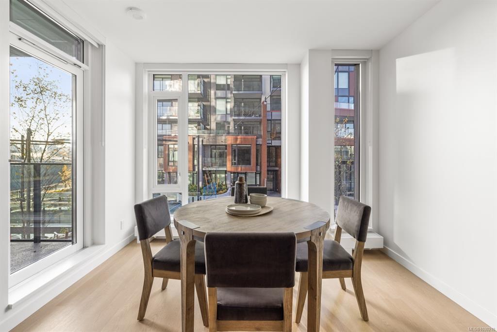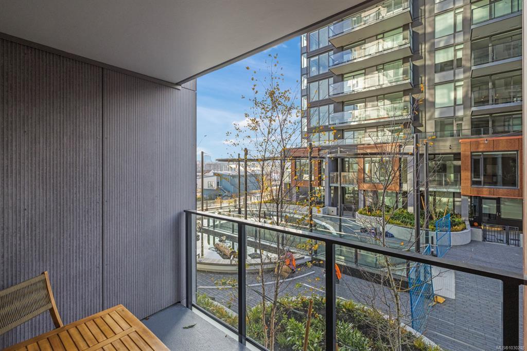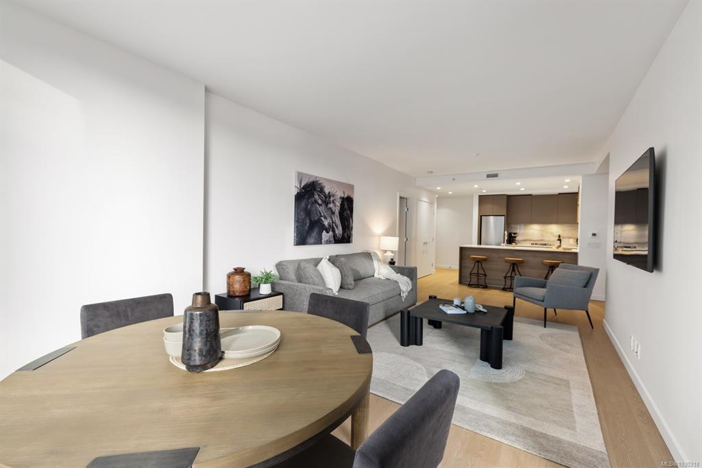 Welcome to Dockside Green- well suited to single professionals or couples seeking a true work-from-home layout. This spacious one-bedroom residence offers almost 900 sq ft of functional living, with a generous den that provides an ideal workspace and room for guests. Expansive windows fill the home with natural light, while the chef’s kitchen features elegant cabinetry, gleaming countertops & refined finishes alongside a spa-inspired bath. A private south-facing balcony offers a quiet outdoor retreat. Enjoy proximity to the Galloping Goose Regional Trail and a setting just outside Downtown Victoria that offers convenient access to the city while maintaining a relaxed neighboruhood feel. Stroll oceanfront pathways or visit nearby cafés, groceries & amenities at Westside Village. Building amenities include a gym, bike service room, pet wash, resident lounge, and rooftop terrace with BBQs and sweeping views. EV-ready parking and separate storage included. Feel good about where you live.
