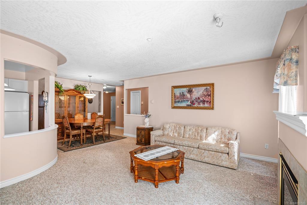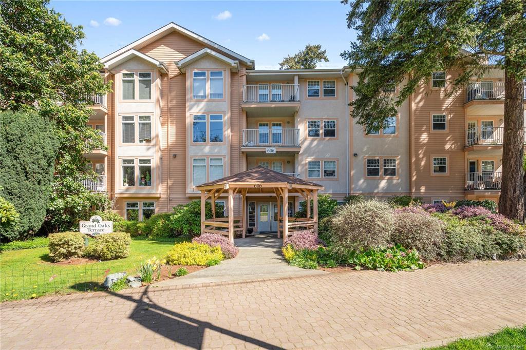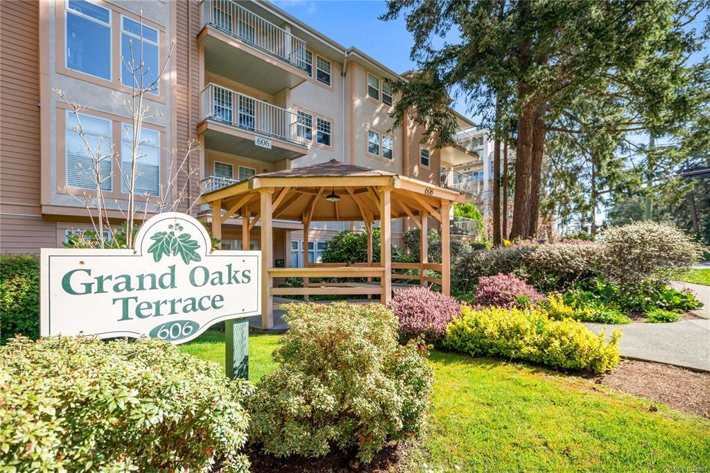 Spacious Ground Floor 2 bed/2 bath Corner Suite at Grand Oaks Terrace. This beautifully maintained 1,119 sq ft corner unit sits on the sunny side of the building with one of the most desirable floor plans. The thoughtful layout offers privacy, with a generous living area separating both bedrooms. The living room features a cozy gas fireplace and opens to a private patio with a gate — perfect for pet owners or easy access. A small garden area adds to the charm. The kitchen includes a newer fridge and stove, and both bedrooms are well sized. Complete with a walk-in laundry room, parking, and dedicated storage. This well-managed, pet-friendly building is ideally located in the heart of the Westshore — shopping, dining, recreation, medical services, and transit all within steps. A fantastic opportunity for comfortable, convenient living in a highly walkable location. Immediate occupancy available.