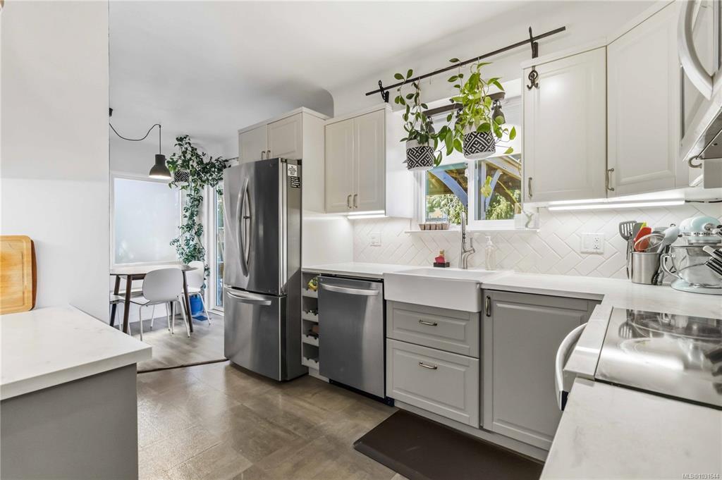 Positioned on an expansive lot this nicely updated 3-bed, 2-bath Saanich home offers incredible access to schools at every level, local shops, parks, transit hubs, and countless outdoor adventures. Thoughtfully renovated, this turnkey property welcomes you with an airy main floor featuring a sun-filled living room, a modernized kitchen flowing into a dining area leading to an oversized covered deck with hot tub hook-up, overlooking established gardens.  The upper level features a complete 4-piece bath, and three comfortable bedrooms—including a generous primary suite. The lower level boasts a roomy recreation space, a substantial laundry area with storage, a half bathroom, and a flexible den perfect for remote work. The professionally painted exterior shines with an attached garage, plus extensive driveway parking for recreational vehicles, a secure perimeter fence, raised garden beds, a greenhouse, outdoor storage shed, and  irrigation system. Don't miss out on this great buy!