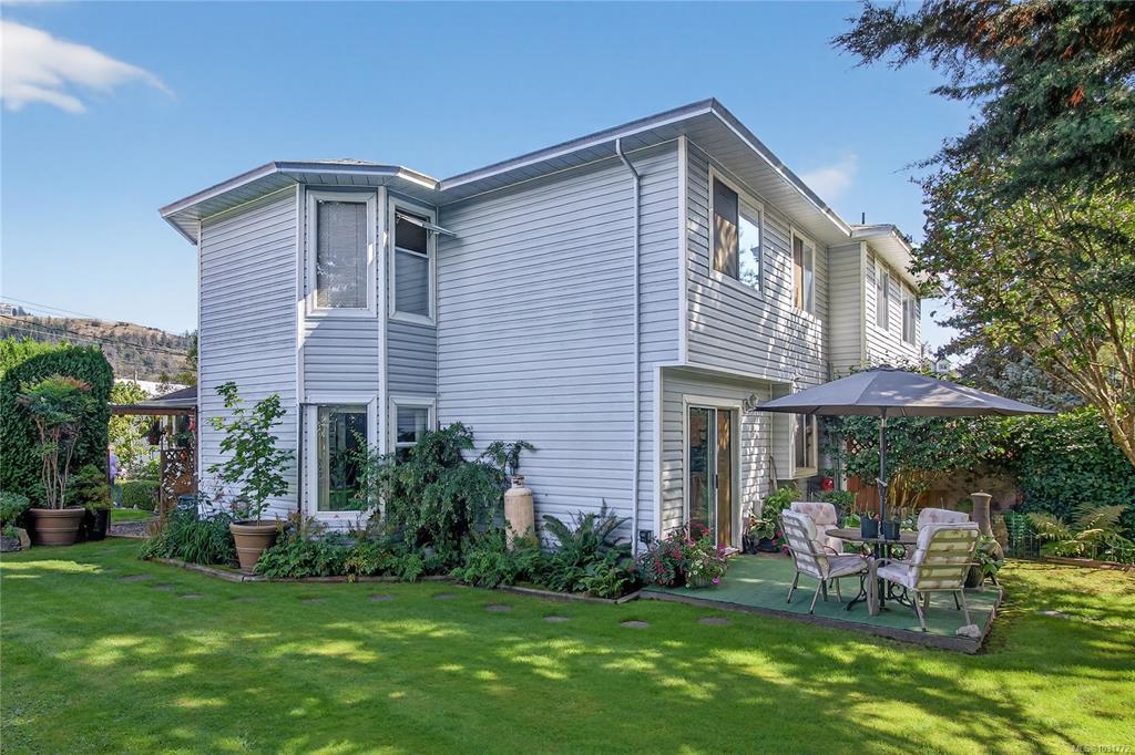 Welcome to this charming and well-kept HALF DUPLEX nestled in Langford’s sought-after Goldstream neighborhood. Tenanted for over 25 years and lovingly cared for like it was their own. BOTH SIDES OF THIS DUPLEX ARE CURRENTLY FOR SALE. Main floor features a formal living room with a cozy gas fireplace and kitchen with a generous dining area, perfect for hosting family dinners or entertaining guests. From the kitchen, walk out to a private patio surrounded by lush gardens, ideal for relaxing or enjoying your morning coffee. Laundry room and a full 3-piece bathroom round out the main level. Upstairs, you’ll find three roomy bedrooms, including a large primary with its own ensuite, plus a full 4-piece bathroom for the rest of the family. The single-car garage offers convenience, and the beautifully landscaped yard adds curb appeal and tranquility. Tucked away at the end of a quiet cul-de-sac, this home offers direct pathway access to Willway Elementary, perfect for families with young kids.