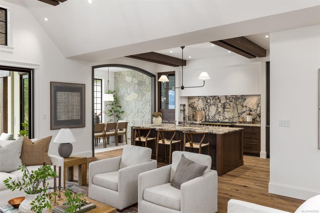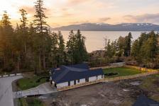 Open Sat & Sun 1-3pm. Set on a beautifully landscaped half-acre corner lot with ocean views, this exceptional 2,850 sq ft home offers refined one-level living with impressive attention to detail. Featuring 3 bedrooms and 2.5 bathrooms, the heart of the home is a stunning 20’ x 24’ great room with soaring 17-ft ceilings. Gorgeous wainscoting and engineered hardwood flow throughout. The chef’s kitchen boasts fully integrated appliances, Sub-Zero fridge and freezer, La Cornue 5-burner gas range with dual electric ovens, two dishwashers, and marble countertops. The spa-inspired ensuite features heated tile floors, marble counters, and an elegant clawfoot soaker tub. Additional highlights include quartz counters, custom Thomas Phillips cabinetry, copper downspouts, heat pump, 615 sq ft garage, and fully irrigated landscaping. A rare offering blending coastal beauty, luxury, and effortless single-level living.