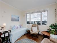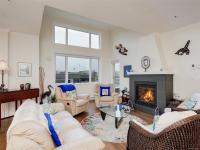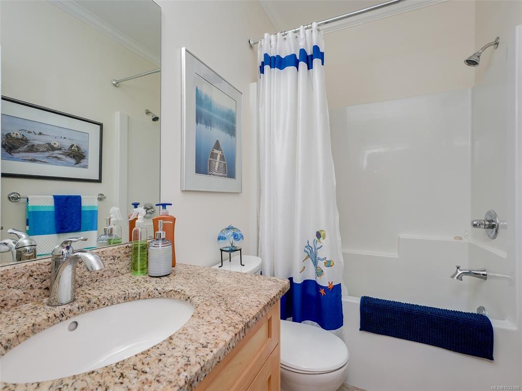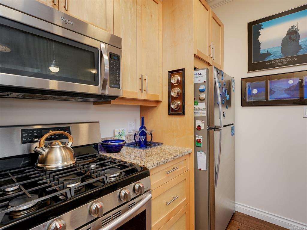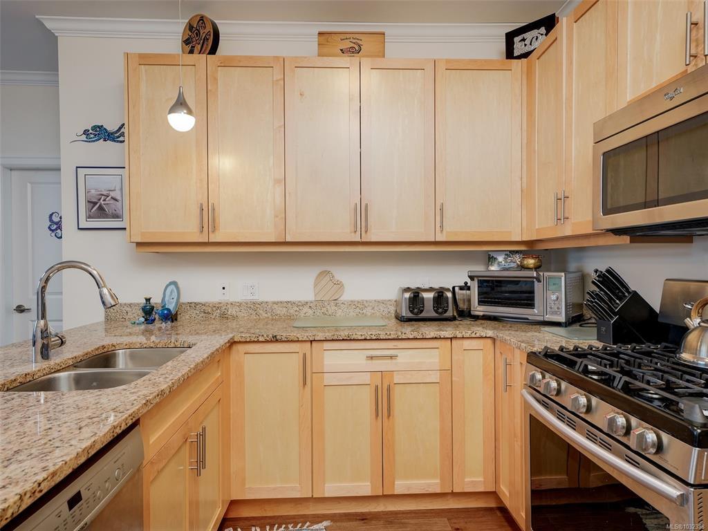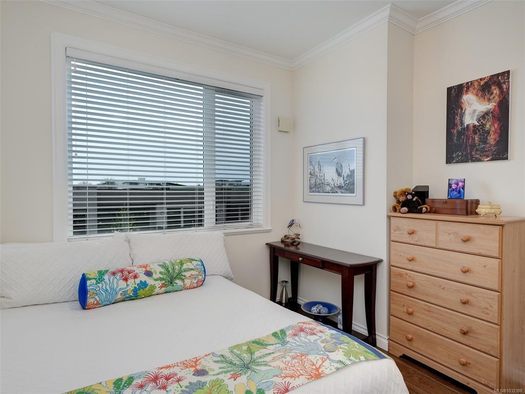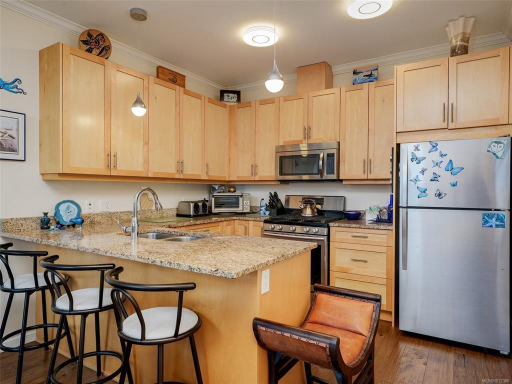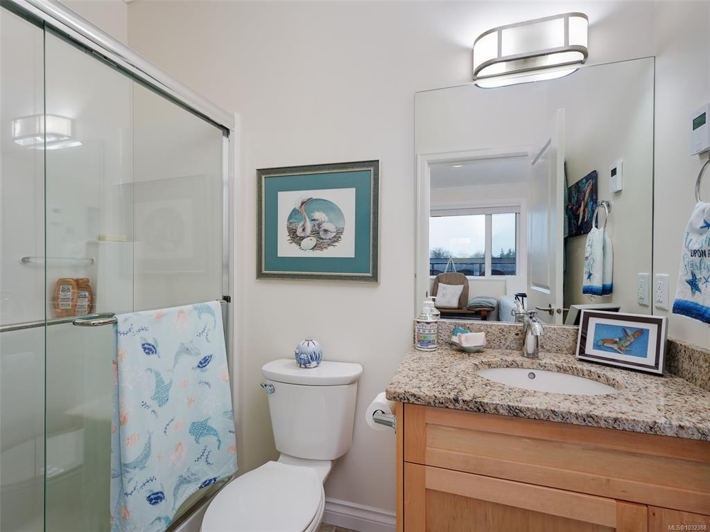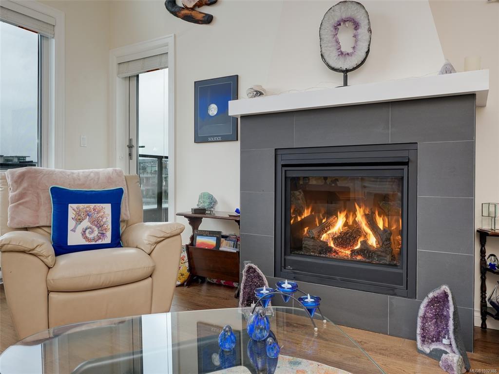 TOP FLOOR CORNER suite in The Watertower designed to impress with vault ceilings, open floor plan, separated bedrooms and plenty of storage. With an overall sense of space, light and warm quality finishes throughout, this home must be seen in person, especially to take in the 180 degree views of the city and mountains from the tiled corner balcony, truly a rare offering in this price range. The thermostatically controlled gas fireplace adds ambience and heat, the gas range is a cook's delight. The Primary Bedroom, currently being used as a flex room, can fit a full suite of furniture, has a walk-in closet plus ensuite with walk-in shower. The laundry room also provides storage plus the unit includes a storage locker and covered parking stall. No age restriction, one dog or one cat welcome. A professionally managed well located building steps to a bus stop, the waterfront walkway and all that vibrant downtown Sidney has to offer. A magical lifestyle awaits you!