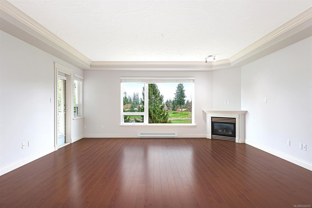 Welcome to sought-after Corinthia Estates! This spacious 1,421 sq ft second-floor condo offers 2 bedrooms, 2 bathrooms, and a den, with stunning golf course views spanning the 3rd, 4th, and 5th fairways. The well-appointed kitchen features rich wood cabinetry, granite countertops, stainless appliances, and a central island with seating. The bright great room offers a cozy gas fireplace and opens to a covered deck—perfect for morning coffee or evening relaxation. The generous primary bedroom includes a large ensuite with double sinks. Additional highlights include elevator access, secure underground parking, 2 storage lockers, and beautifully maintained grounds with a tranquil water feature. Pet-friendly (1 dog or 1 cat) and non-smoking.