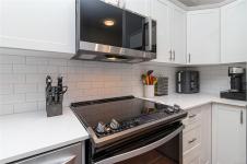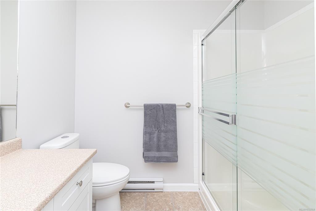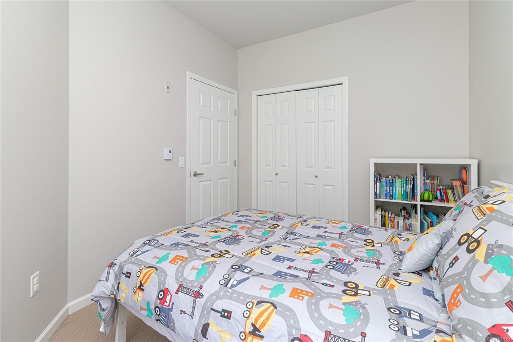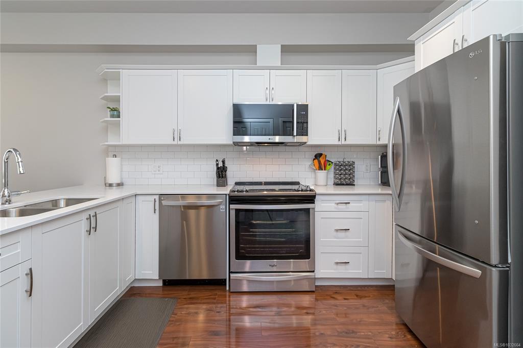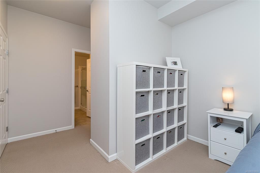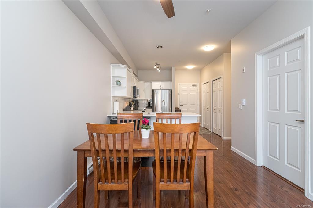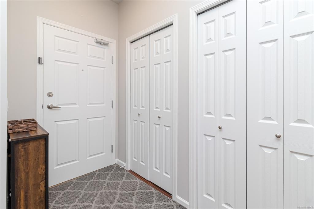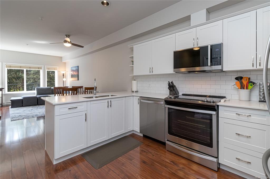 Sun-soaked, south-facing top floor condo overlooking Colwood Golf Course! This beautifully updated 2 bedroom, 2 bathroom home offers a bright, open-concept layout with thoughtful design throughout. The spacious primary bedroom features a walk in closet, ensuite, while large windows fill the living space with natural light and frame peaceful views of towering fir trees. Step out onto your private deck and enjoy the serene outlook. Tastefully updated with fresh paint, new stainless steel appliances, quartz countertops, a classic subway tile backsplash, and modern light fixtures, this home is truly move in ready with nothing left to do. Built in 2005, this well-maintained complex offers secure underground parking, storage lockers, a separate clubhouse, fitness room, bike storage and a large rooftop deck just down the hall. Ideally located steps to grocery stores, shops, restaurants, transit, and the Galloping Goose Trail, and only minutes to JDF Recreation Centre, parks, and beaches.