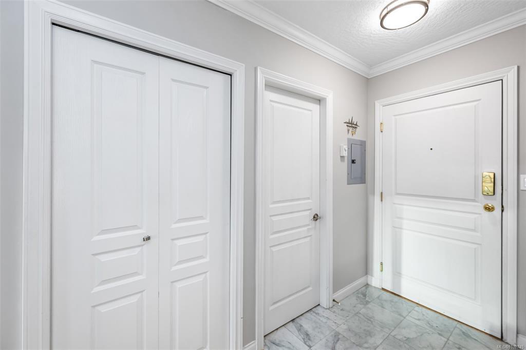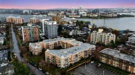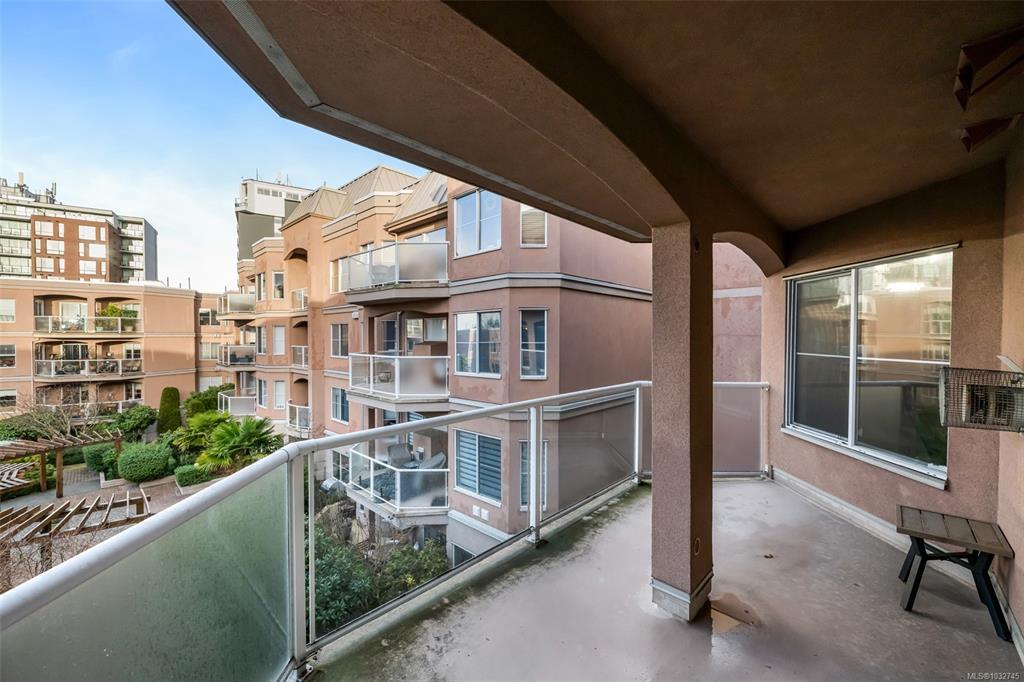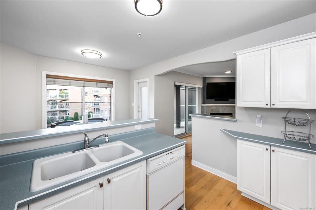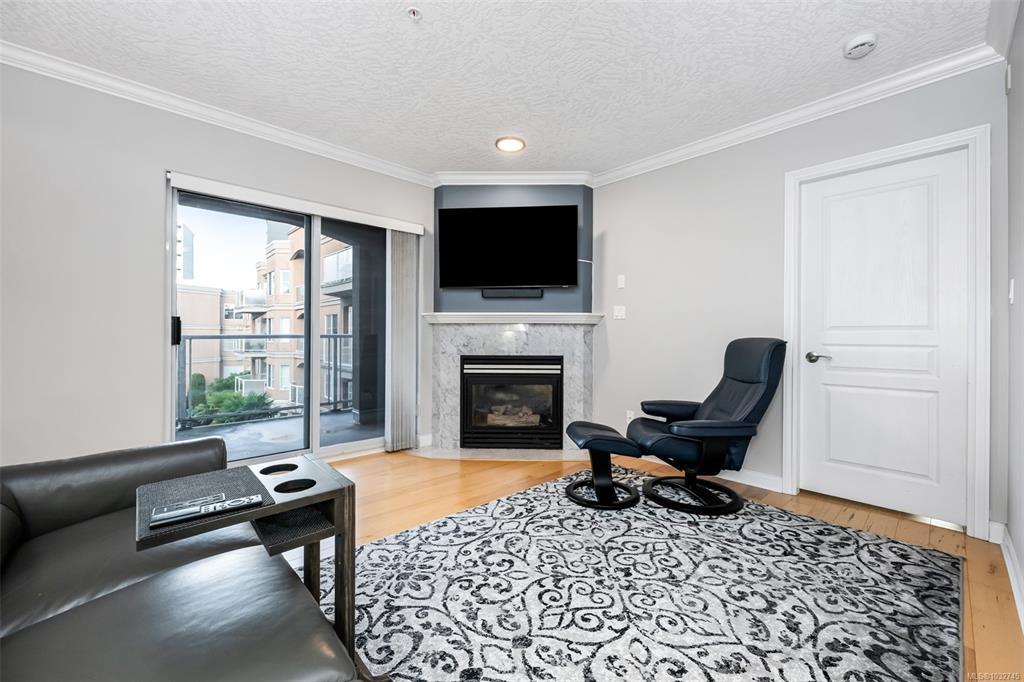 A Fabulous 1 Bedroom plus Den, 1.5 bath Condo with Garden Views and southerly sunny exposure - James Bay living at its best. This attractive condo faces the quiet side of complex and boasts a spacious, open floor plan with good size kitchen overlooking dining area viewing the wonderful mature flowering garden. The den offers great additional flexible space for a home office, or an overnight guest. The living area has a gas fireplace and has access to a large private balcony for rest or relaxation. The primary suite with walk in closet and ensuite offers opportunity for king size bed and lounge chairs for a reading nook. Step out your front door and stroll vibrant James Bay community just steps away from beautiful inner harbour/marina, restaurants, popular Fisherman's Wharf and downtown shopping. This home includes in-suite laundry, storage locker and U/G parking. Bonus - reasonable strata fee includes gas and hot water. No age limit, 1 dog or cat allowed and rentals. Proactive strata.