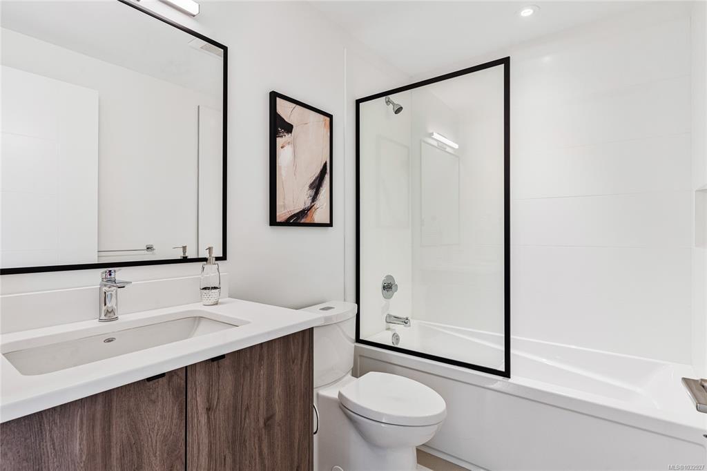 JUST LISTED! Luxury 3-bed, 4-bath, 2000+ sq ft townhome in a quiet enclave surrounded by mature homes & friendly neighbourhood. Contemporary features including soaring rooflines, stone/wood accents, transom windows + LR, DR, media room & office nook. Main level: 9' coffered ceilings, floor-to-ceiling windows, engineered hardwood floors, fireplace, gourmet kitchen w/ quartz counters, wall oven, gas cooktop, XL island, SS appliances, open-concept dining, & powder rm. Upstairs: vaulted 13' ceilings, luxe primary w/ walk-through closet & spa-like ensuite, 2 more beds, full bath & laundry. Lower: 8' ceilings, media/rec room, additionation storage, utility closet & EV-ready garage. Extras: remote blinds, HW on demand, heat pump, organizers & quality fixtures. Fenced yard backing green space w/ water feature, shared garden bed plots & community park. Built by award-winning White Wolf Homes with full New Home Warranty. Mins to shops, trails & downtown Victoria.