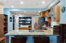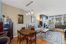 A spacious courtyard unit in desirable Pacifica! This 2 bed, 2 bath condo features a generous kitchen with gas range and large island opening into a dining space that will easily accommodate a full sized dining table. The living room has floor to ceiling windows and features a gas fireplace. The oversized primary bedroom allows for a sitting area or office. An ensuite and walk in closet complete this luxury retreat. Air conditioning in the living and primary ensure year round comfort. Both the primary and the living room have access to a covered patio which extends your living space year round. Opening onto the courtyard, this home has easy access to the waterfront promenade. Pacifica offers concrete construction, underground secured parking and bike storage, on site management & caretaker, and a storage locker located on the same floor as the unit. The building is pet friendly (No size limit on dogs!) and the strata fee includes gas for your fireplace, cooking stove, and BBQ.