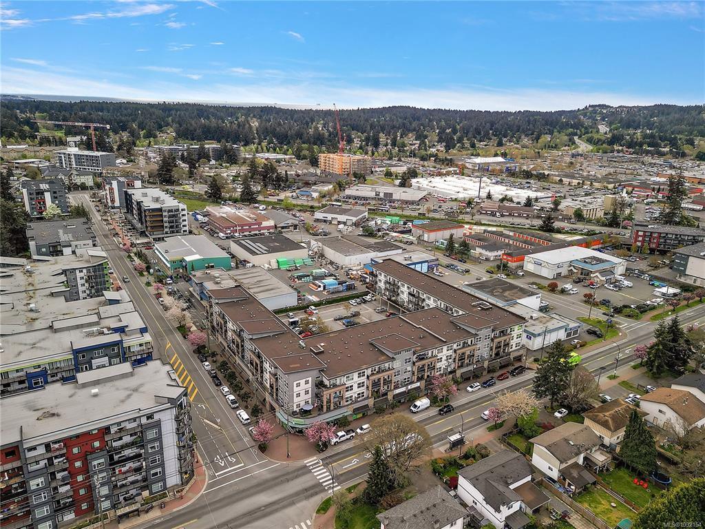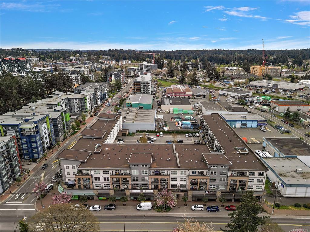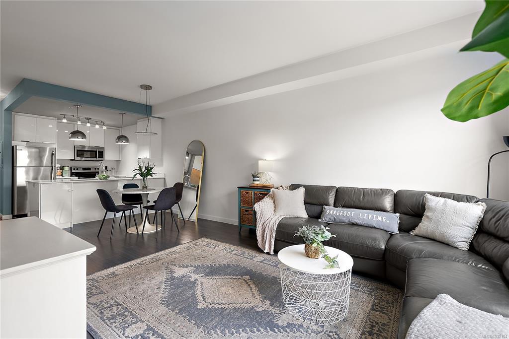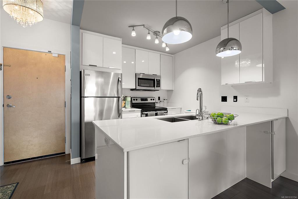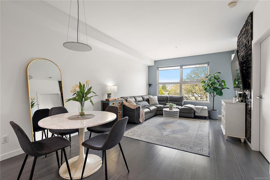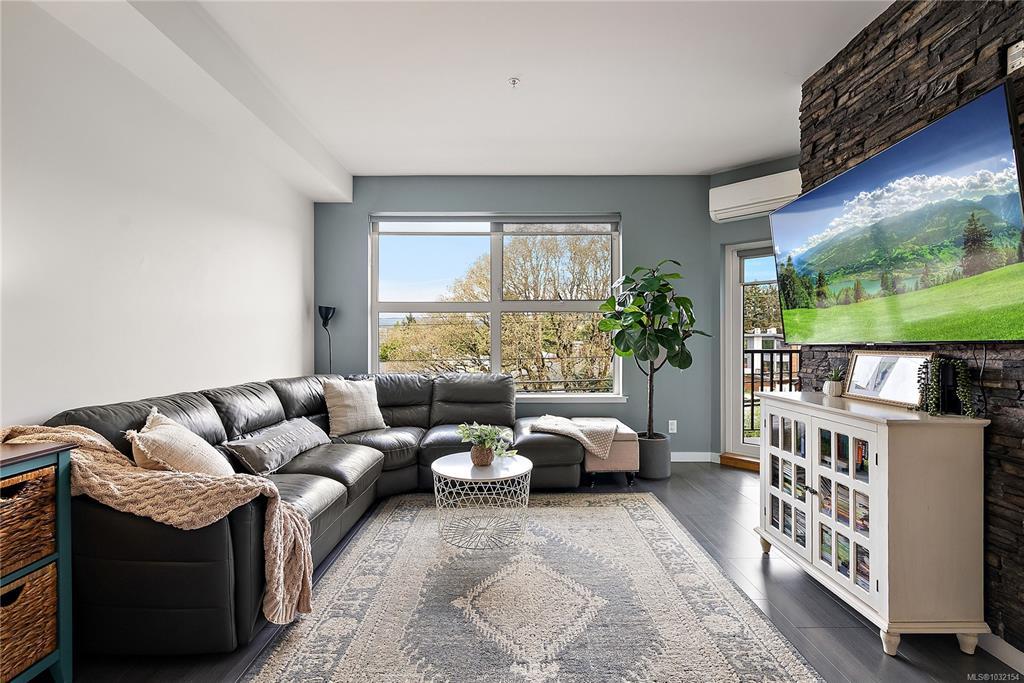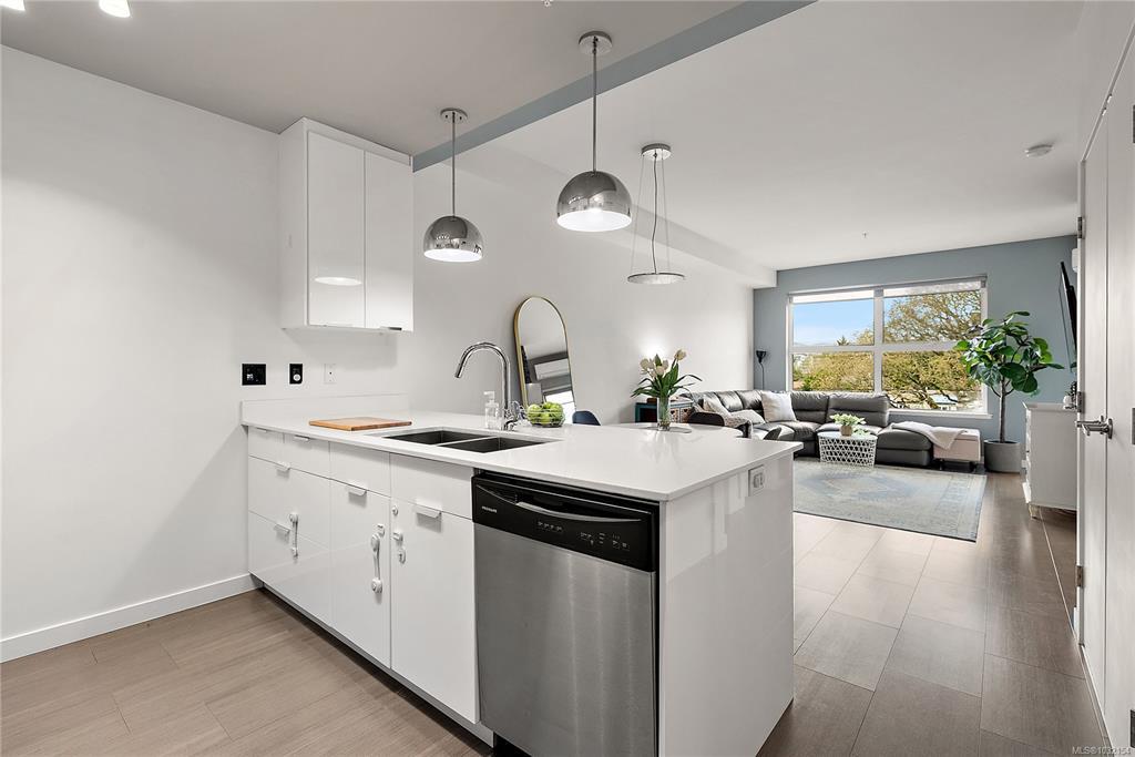 Stylish and modern 2-bedroom condo in the sought-after Utopia residences, perfectly located in the heart of downtown Langford. This well-appointed 681 sq/ft home features a smart, open-concept layout with 9’ ceilings, sleek laminate flooring, and a contemporary kitchen complete with quartz countertops, stainless steel appliances, soft-close cabinetry, and an eating bar. Enjoy year-round comfort with an energy-efficient heat pump and outdoor living on the desirable corner (covered) balcony which is perfect for relaxing or entertaining. The primary bedroom offers a walk-in closet and cheater ensuite with heated tile floors, while the second bedroom/den is ideal for guests, kids or a home office. Pets and rental-friendly, this unit includes parking, storage, and secure FOB entry, all in a well-managed building just minutes from all amenities including shopping, dining, restaurants, and Langford Lake.