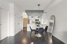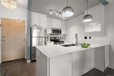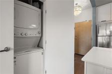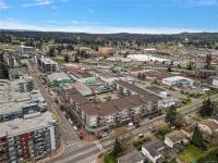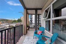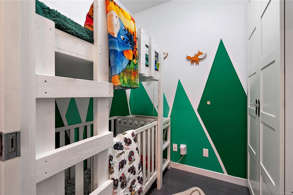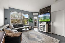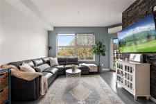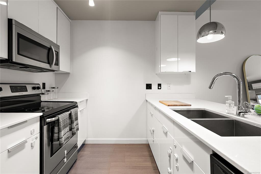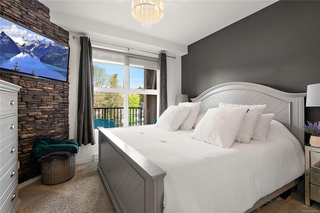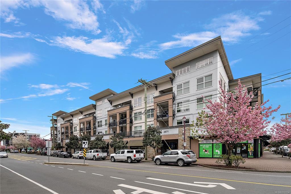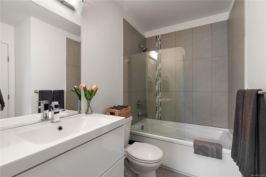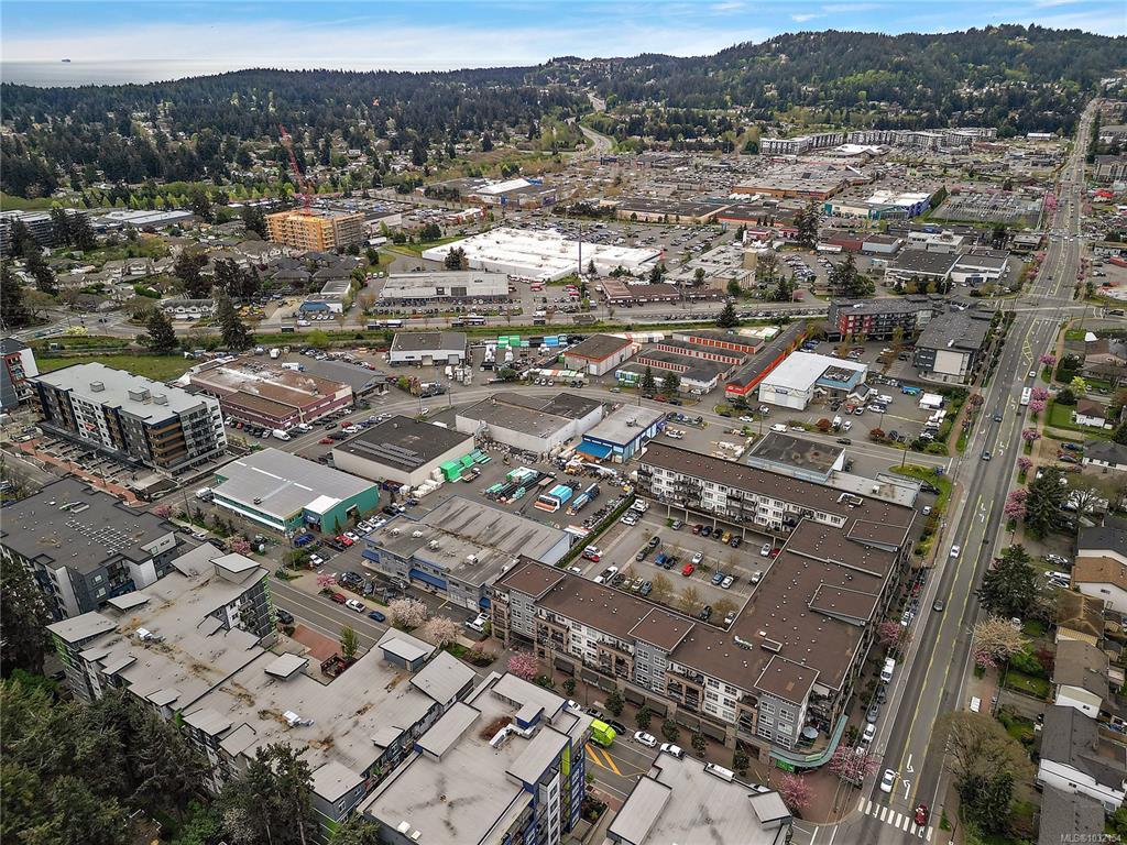 Stylish and modern 2-bedroom condo in the sought-after Utopia residences, perfectly located in the heart of downtown Langford. This well-appointed 681 sq/ft home features a smart, open-concept layout with 9’ ceilings, sleek laminate flooring, and a contemporary kitchen complete with quartz countertops, stainless steel appliances, soft-close cabinetry, and an eating bar. Enjoy year-round comfort with an energy-efficient heat pump and outdoor living on the desirable corner (covered) balcony which is perfect for relaxing or entertaining. The primary bedroom offers a walk-in closet and cheater ensuite with heated tile floors, while the second bedroom/den is ideal for guests, kids or a home office. Pets and rental-friendly, this unit includes parking, storage, and secure FOB entry, all in a well-managed building just minutes from all amenities including shopping, dining, restaurants, and Langford Lake.