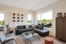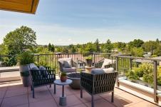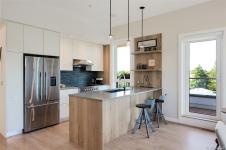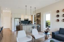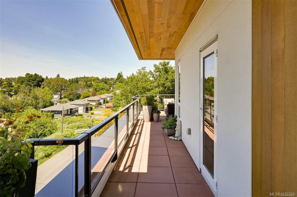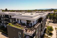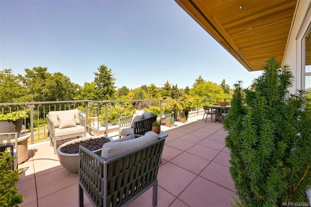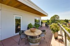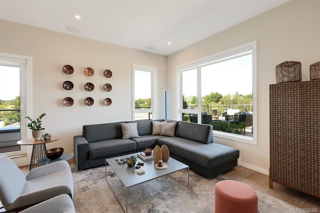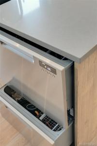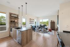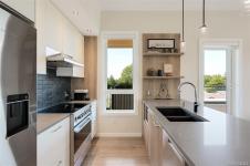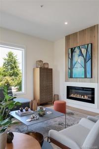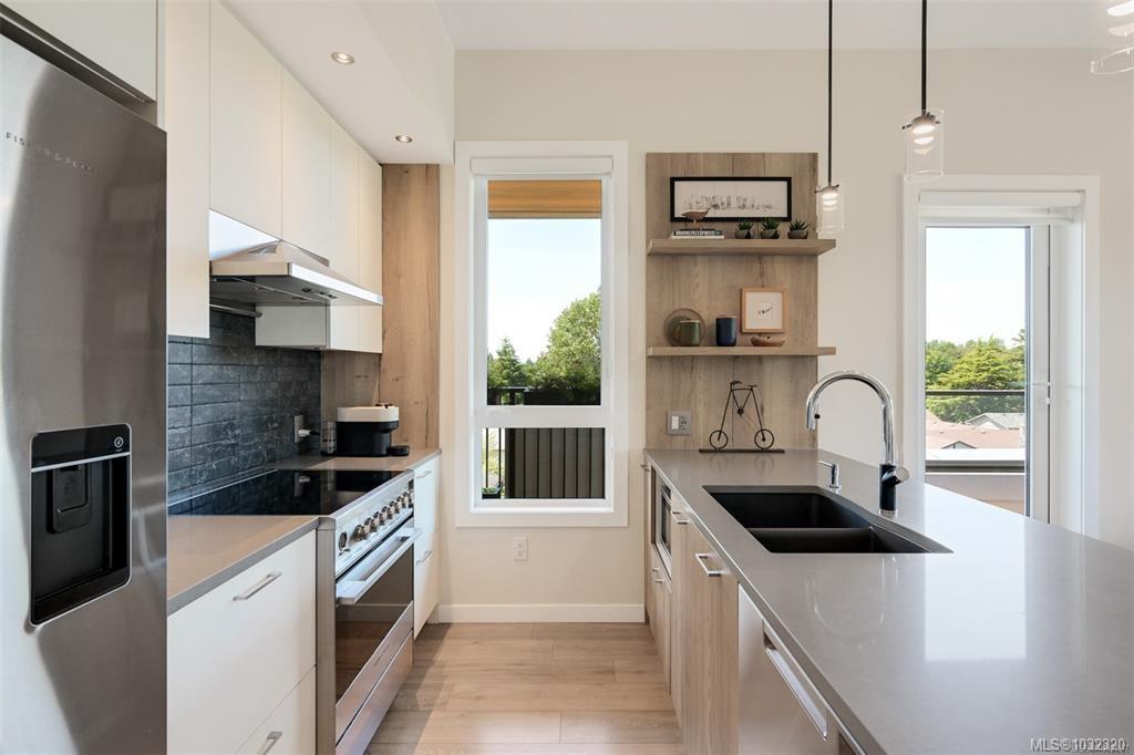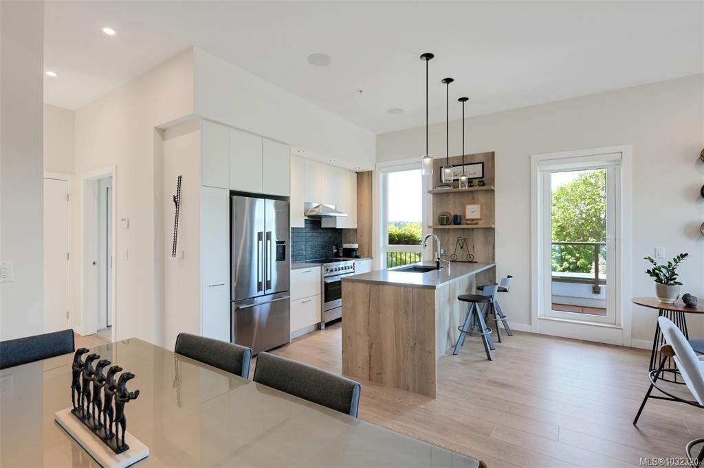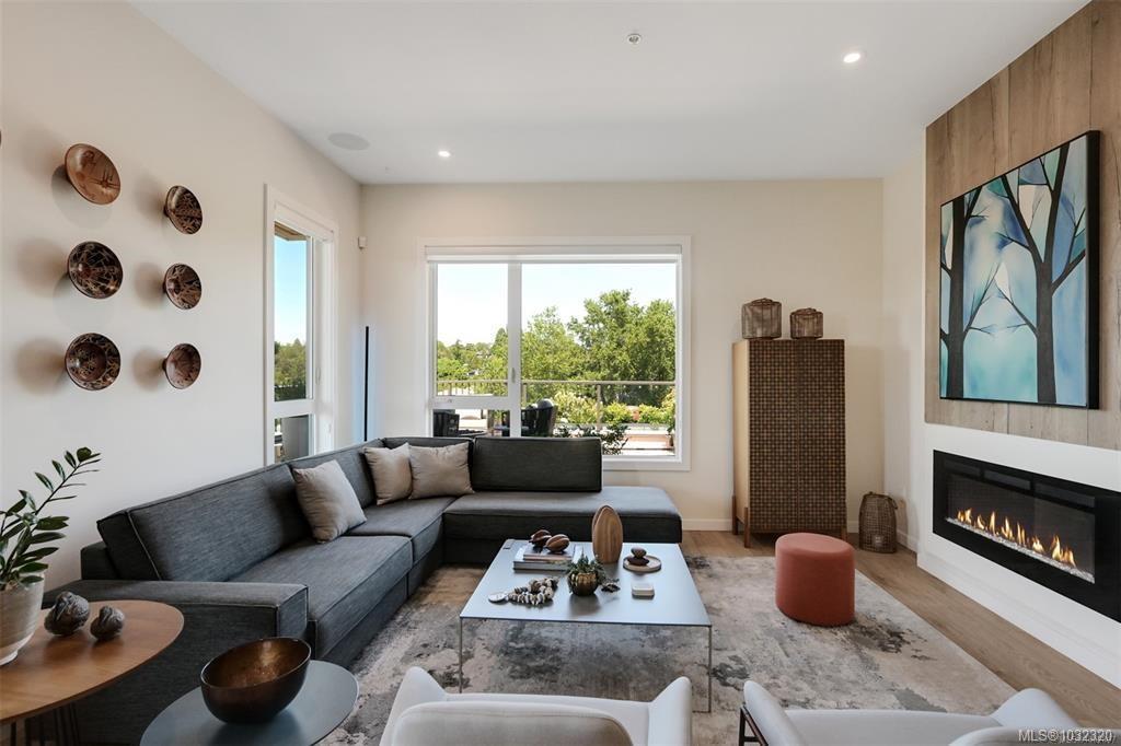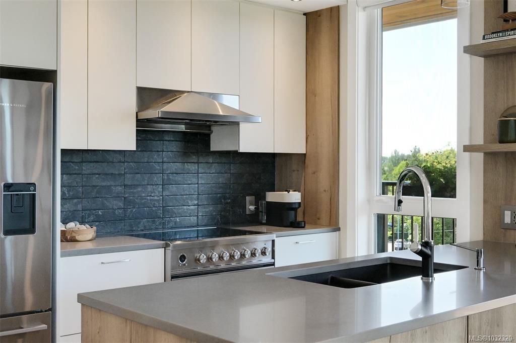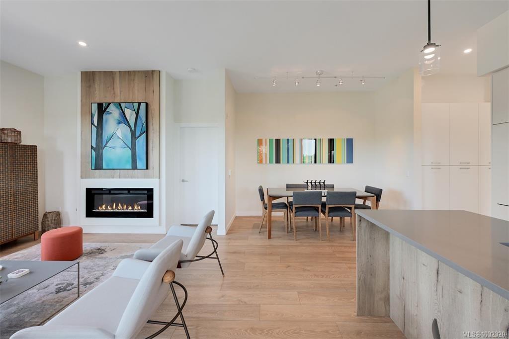 Experience elevated living in this like-new top floor corner penthouse offering nearly 1,300 sq ft of beautifully finished interior space, complemented by an impressive 600 sq ft west-facing terrace with distant views of the Sooke Hills. The well-designed layout features 2 spacious bedrooms, each with its own ensuite and ample closet space, plus a third full bathroom for guests. A bright, separate den provides an ideal space for working from home. The open concept living area is enhanced by 10' ceilings, expansive windows, and a cozy fireplace. The kitchen is both stylish and functional, showcasing quartz countertops, quality Fisher & Paykel appliances, and generous storage, including a full pantry wall. Additional features include a Control 4 smart home system, 2 secure underground parking stalls with EV readiness, separate storage, and pet friendly living. A rare offering that blends comfort, style, and convenience.