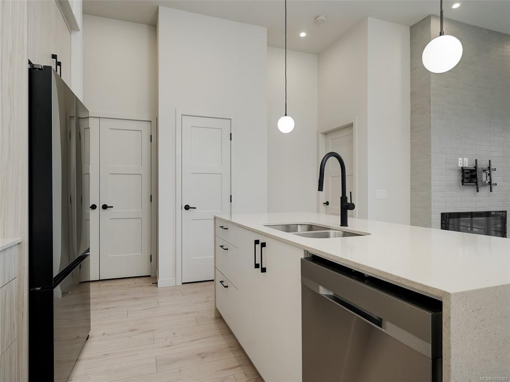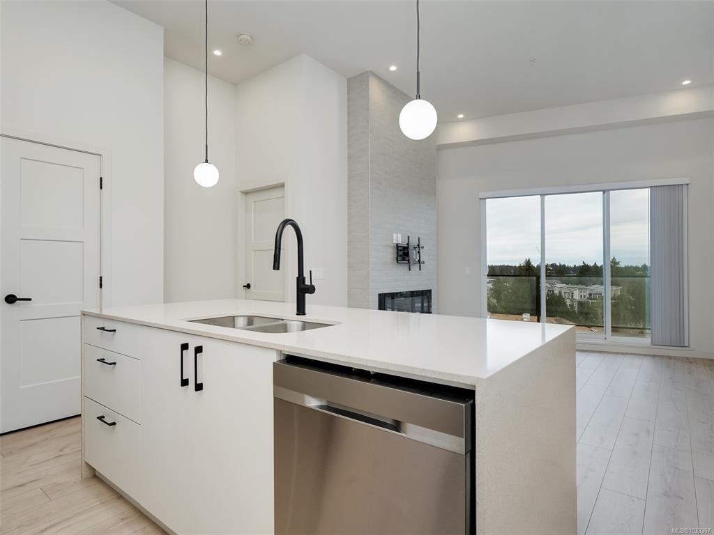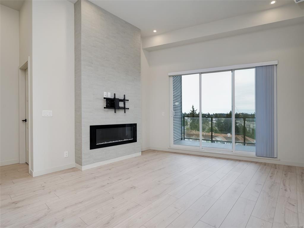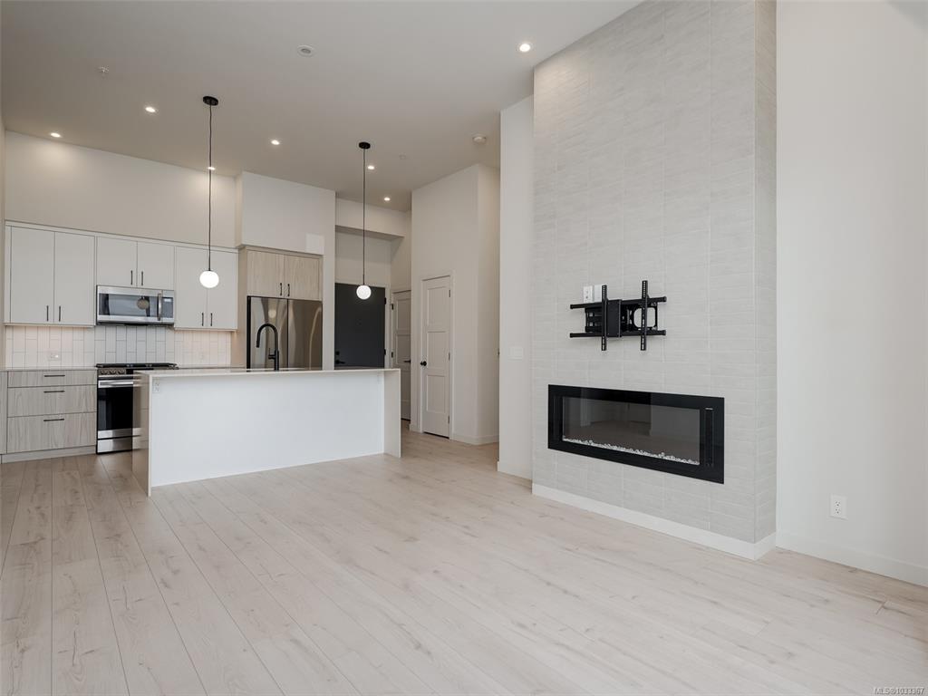 Welcome to this stunning top-floor condo offering modern comfort and stylish design with soaring 10’11” ceilings and bright open-concept living! This 2 bed, 2 bath home features ductless split heat pumps in bedrooms and living room, quartz countertops throughout, tiled backsplash, premium stainless appliance package with gas stove, and stacking laundry. Elegant tiled bathrooms and a modern linear fireplace add to the appeal. Enjoy the large balcony with gas BBQ hookup. Includes 2 parking stalls, storage locker, rooftop BBQ area, fitness room, bike storage, and an amenities/meeting room conveniently located just steps away next door. Conveniently located near Costco Wholesale, shopping, and schools!