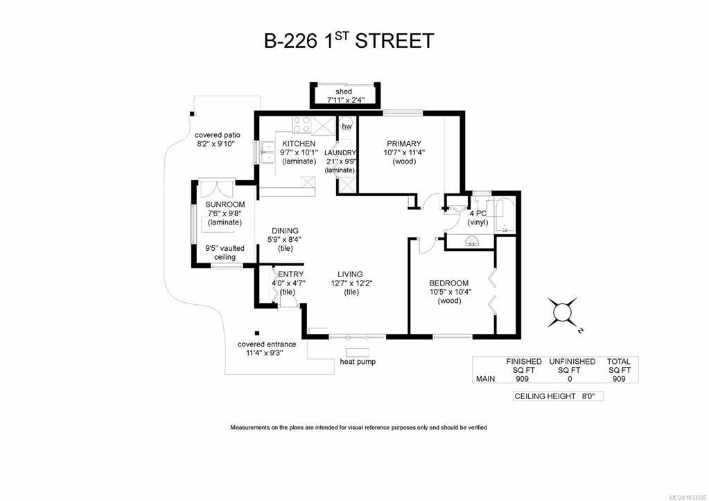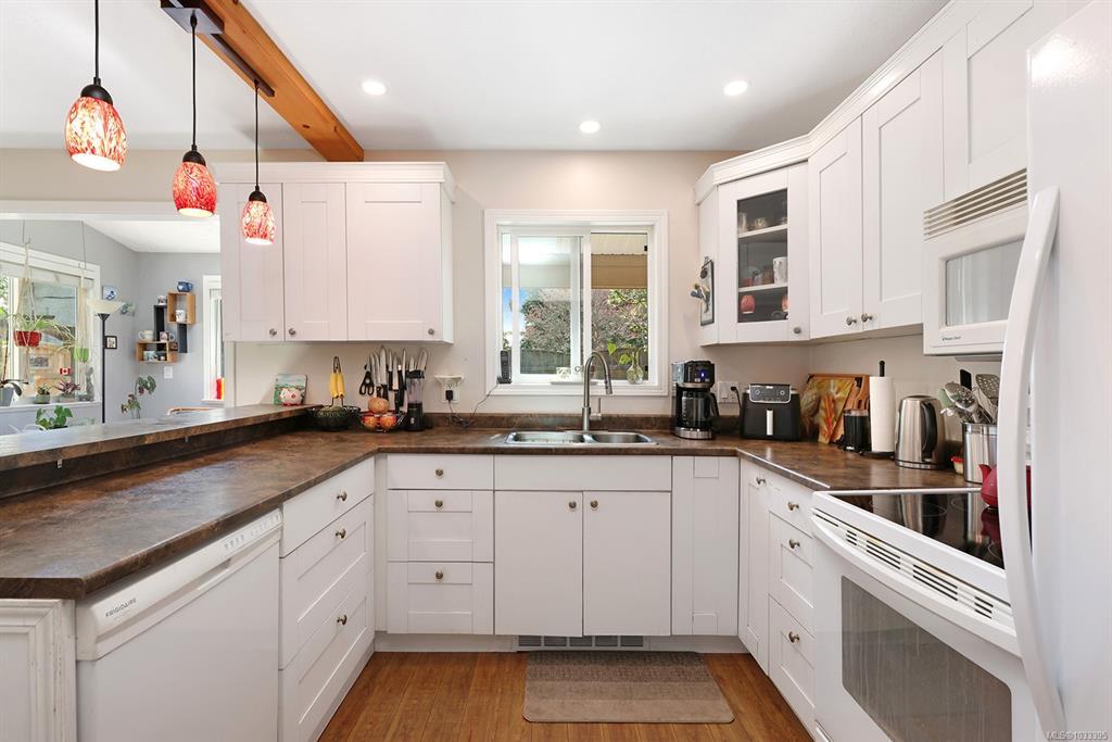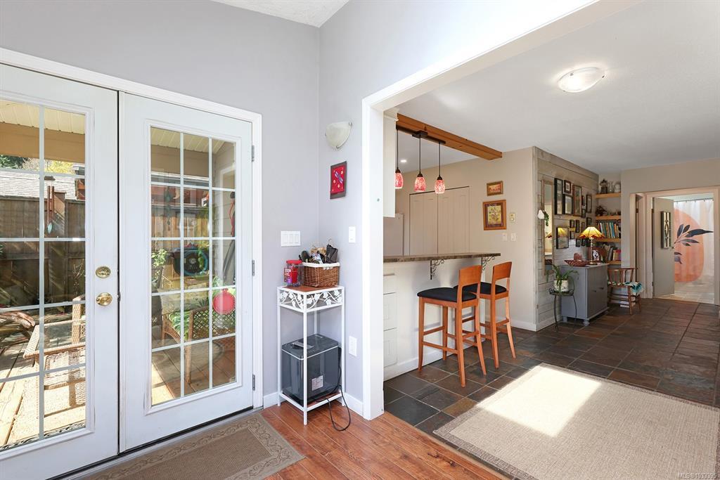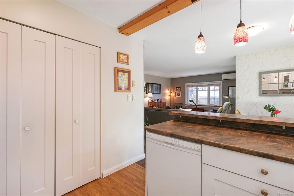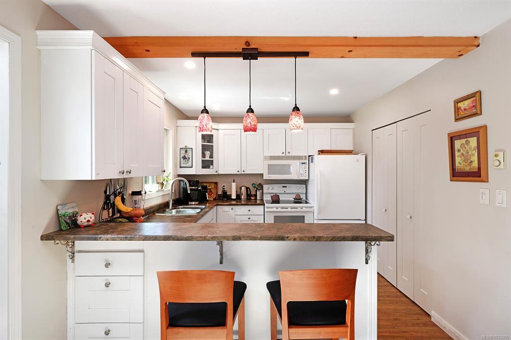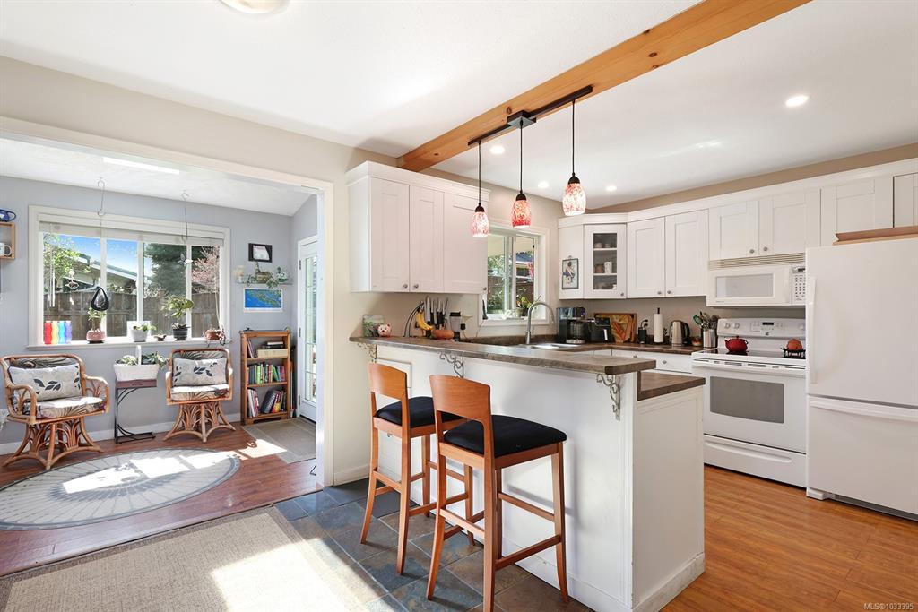 Old Orchard half duplex! Enchanting and simply adorable, streaming sunlight illuminates the sunroom w/ skylight and French doors to access the covered patio. Boasting 909 sf, 2 BD/ 1 BA, this home has been beautifully updated and renovated over the years, bright white modern kitchen w/ shaker cabinets and raised bar with seating, a large pantry closet with stacking washer/dryer. Slate tile flooring, Acacia hardwood flooring, West Coast inspired shiplap and exposed wood beam and open shelves create a comfortable space to entertain friends or enjoy the peaceful serenity of the tranquil gardens. Nestled in a private, fenced yard with access off Cliffe Ave, an easement on title allowing this owner direct access to this unit. Old Orchard, Courtenay’s heritage neighbourhood created in 1892, is a desirable location only 1-2 blocks from all the amenities - shopping, restaurants, pubs, and trails by the river. Split pump for A/C, murphy bed, new gutters, roof 7-8 yrs, Hardie 3 yrs.