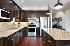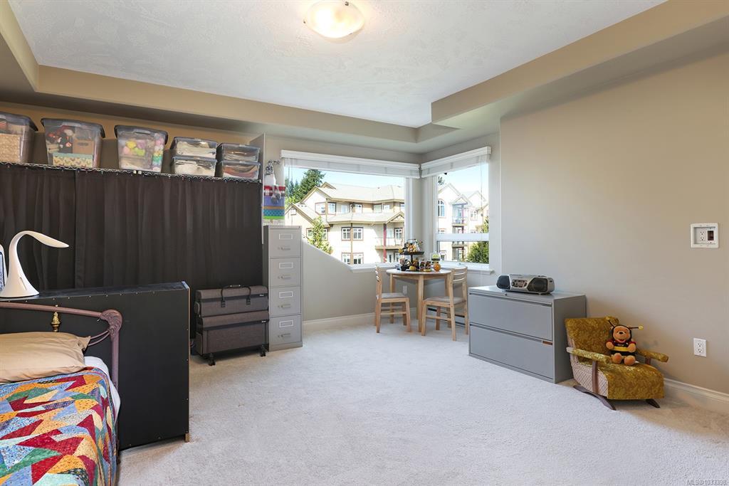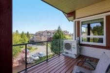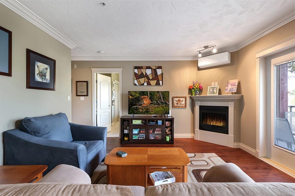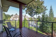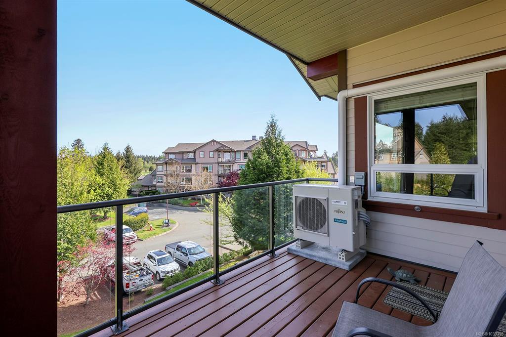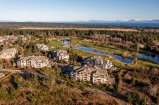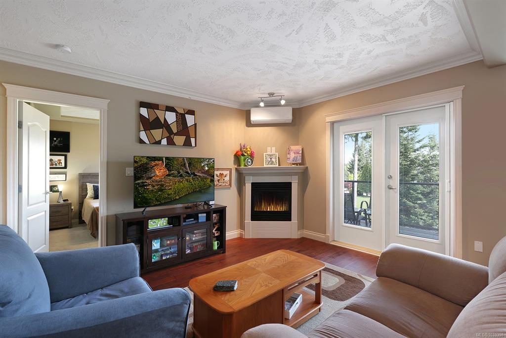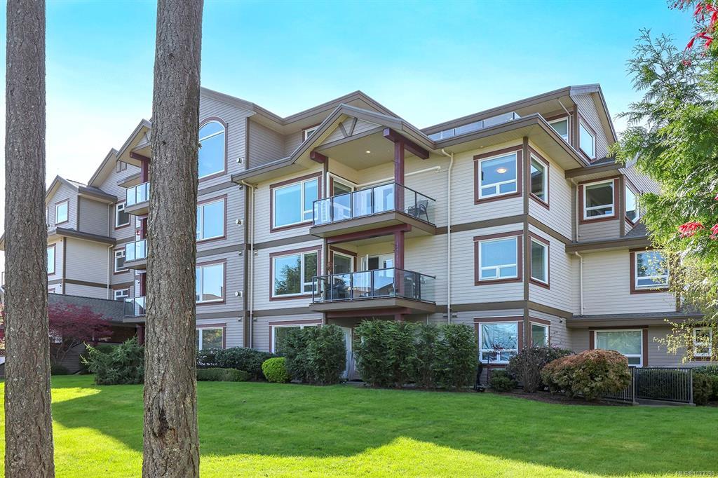 Corinthia Estates at Crown Isle offers resort-style, low-maintenance living in a prime development. Unit #435 is a spacious, quiet corner unit on the third floor, offering 1,514 sqft and features two large bedrooms, two bathrooms, plus a den for your office or crafting! This corner unit is bright, offers open concept living, and some recent improvements include a heat pump with air conditioning and newer Hickory hardwood floors. The kitchen features granite counters, quality cabinetry, stainless appliances, and an island with seating that opens to the main living and dining area. The covered patio has space for dining, as well as a BBQ hookup — ideal for relaxed mornings and evening downtime. The spacious primary bedroom includes a 3-piece ensuite with heated tile floors, and a tiled walk-in shower. There is secure underground parking, plus a 6’x5’ storage unit.
