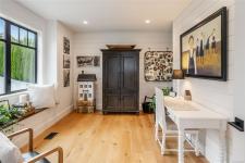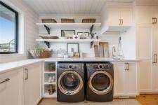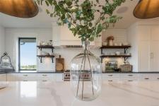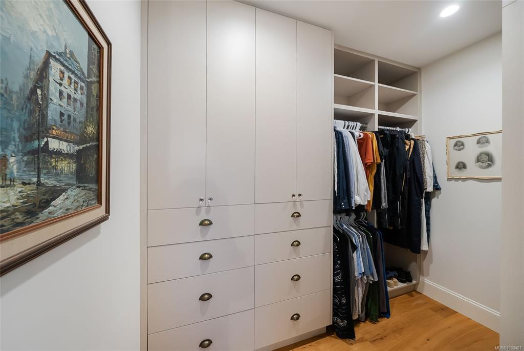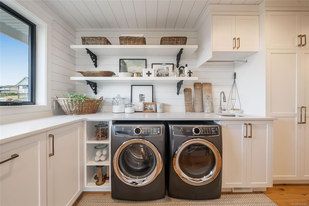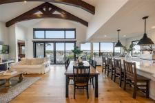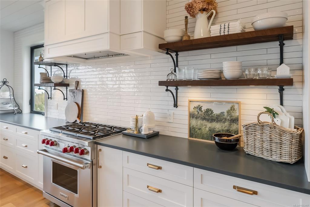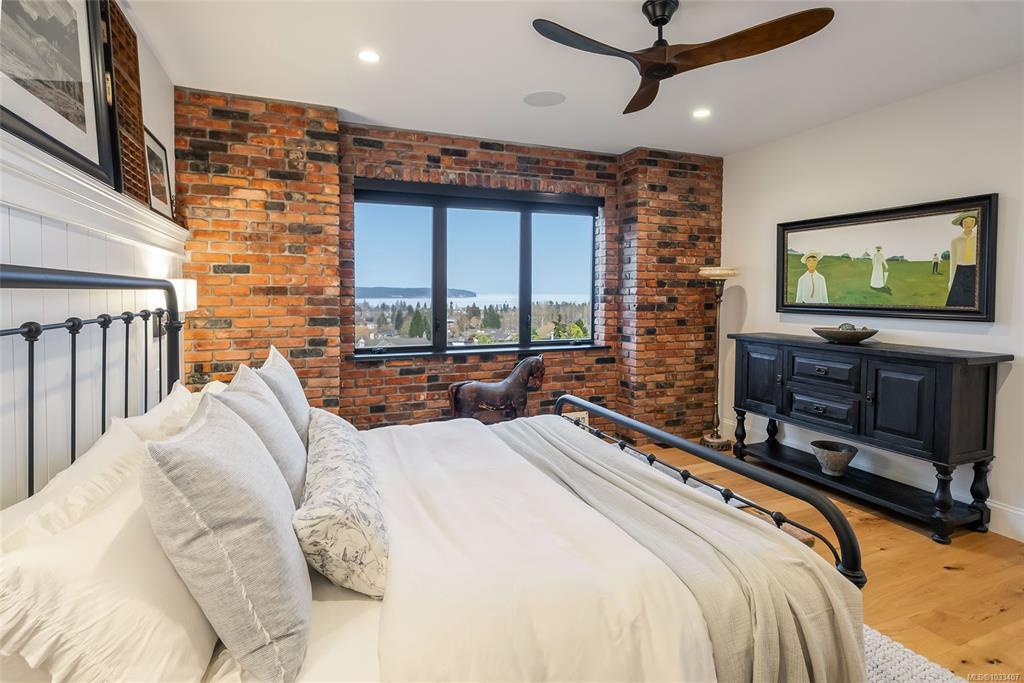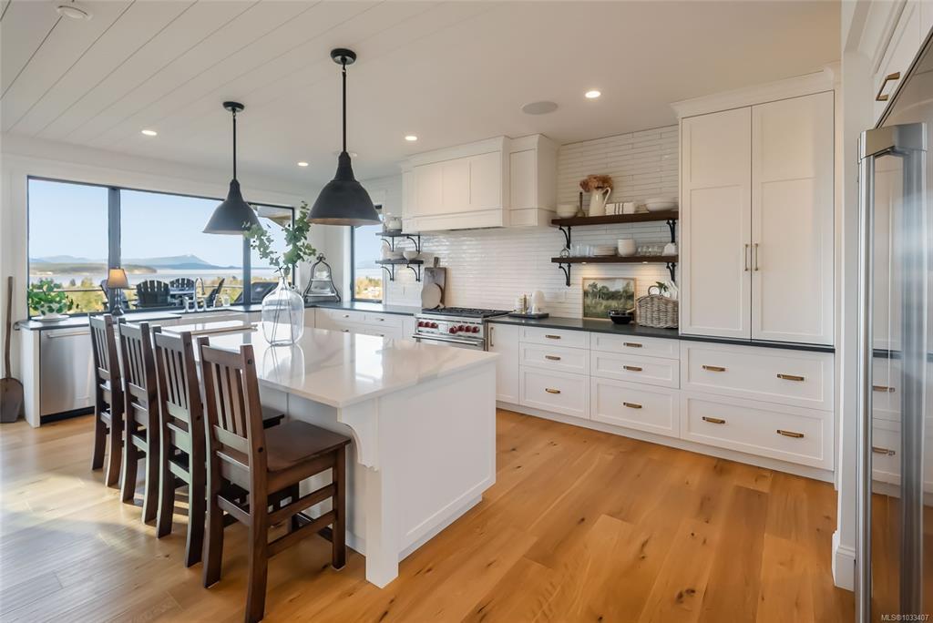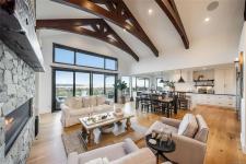 This breathtaking custom-built home with stunning panoramic ocean views was designed with intention and finished to perfection by Twelve Oaks Construction. The living room wows with vaulted ceilings showcasing old-growth custom curved exposed trusses and a sleek linear gas fireplace framed in real stone. The kitchen is a chef’s paradise, with a shiplap ceiling, an oversized quartz-topped island, a full-size fridge and freezer, a Wolf six-burner dual-fuel range, a glass-front fridge, and a walk-in pantry. The primary suite feels straight out of a design magazine, featuring a reclaimed brick accent wall that frames the ocean view window, a spa-inspired ensuite with a walk-in tiled shower and a freestanding soaker tub.