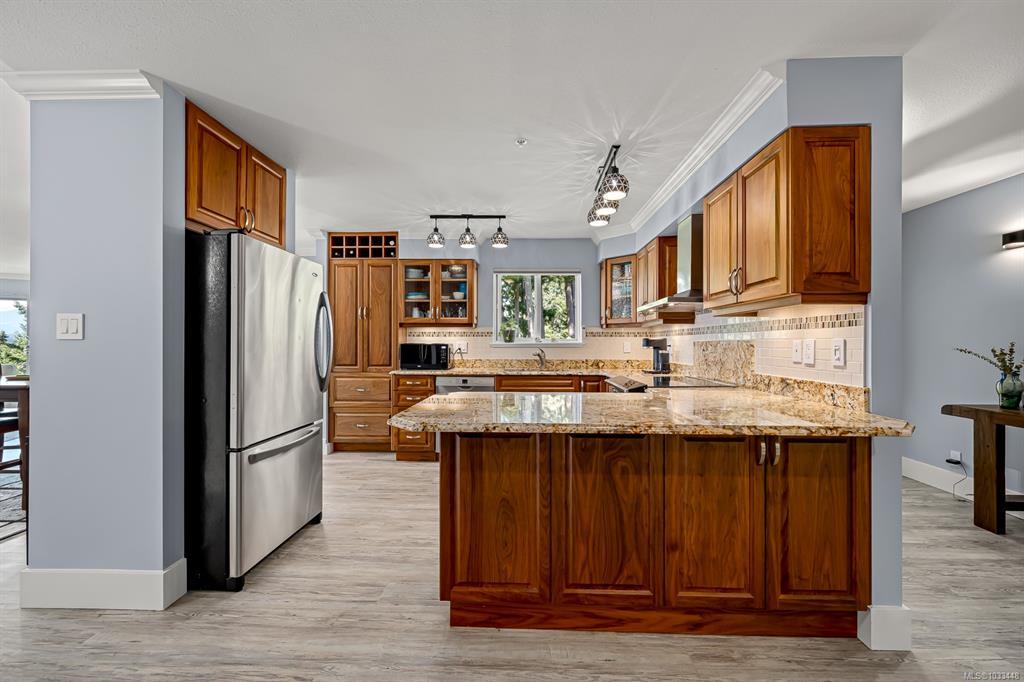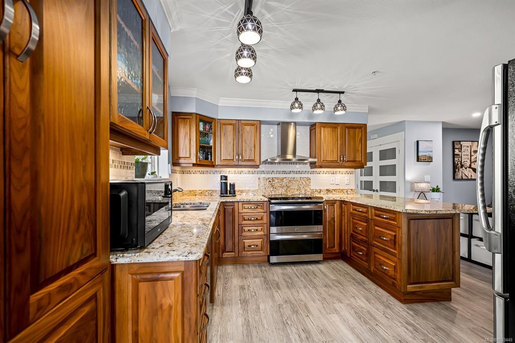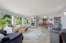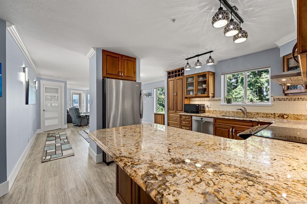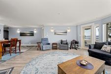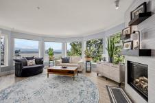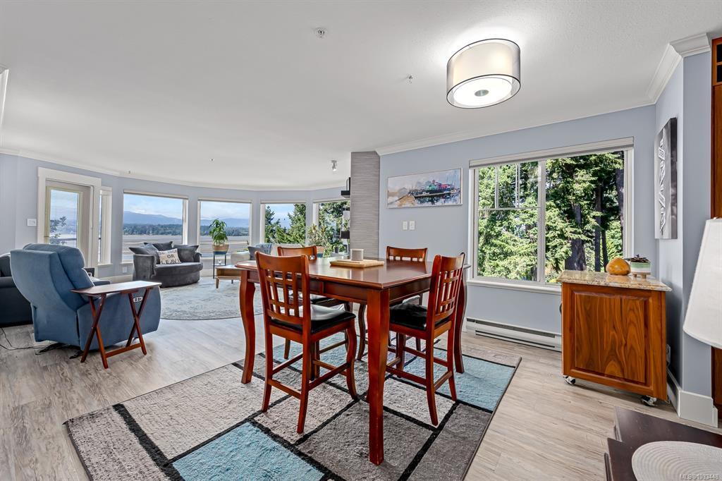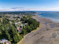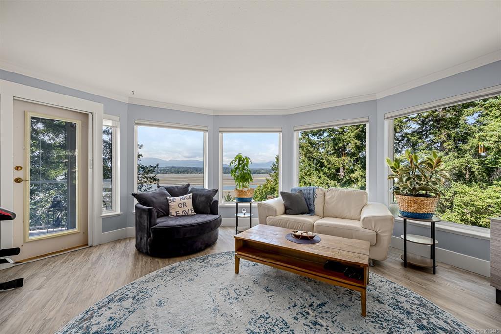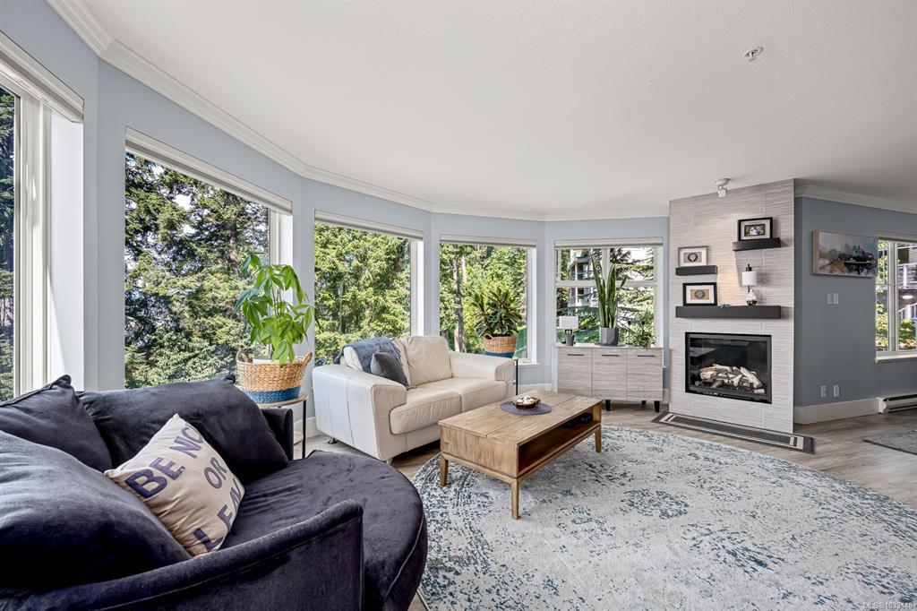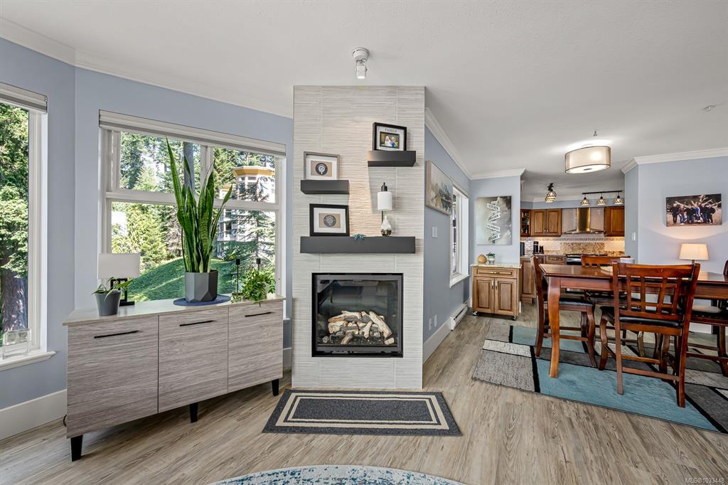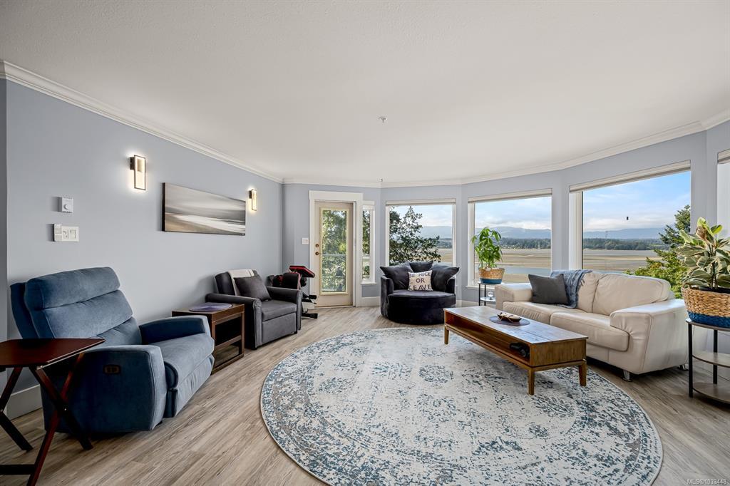 Welcome to coastal living at Emerald Shores. This 1,569 sq.ft. waterfront condo offers easy one-level living with no-stair access from your private attached garage, ideally located beside green space with a pathway to the beach. Inside, panoramic south-facing views of Comox Bay and the Beaufort Mountains fill the home with natural light. The open-concept layout is ideal for relaxing and entertaining, featuring a granite kitchen with stainless steel appliances and a spacious living room with a cozy gas fireplace. Enjoy two private balconies, including one off the main living area with access from the primary suite, plus a front entrance balcony. The primary offers a walkthrough closet and spa-inspired ensuite with double sinks, tiled walk-in shower, and soaker tub. With only one neighbour, privacy is enhanced. Additional features include a separate laundry room, second bedroom, and versatile den. Pet-friendly (one medium dog or cat). 3D tour & video in media links.