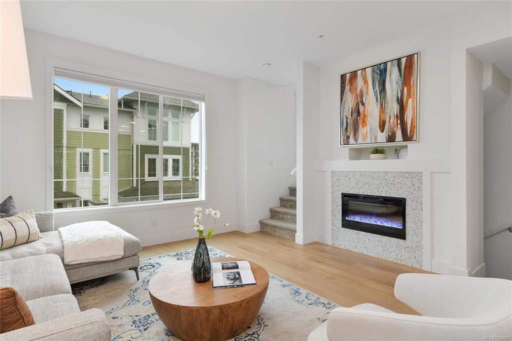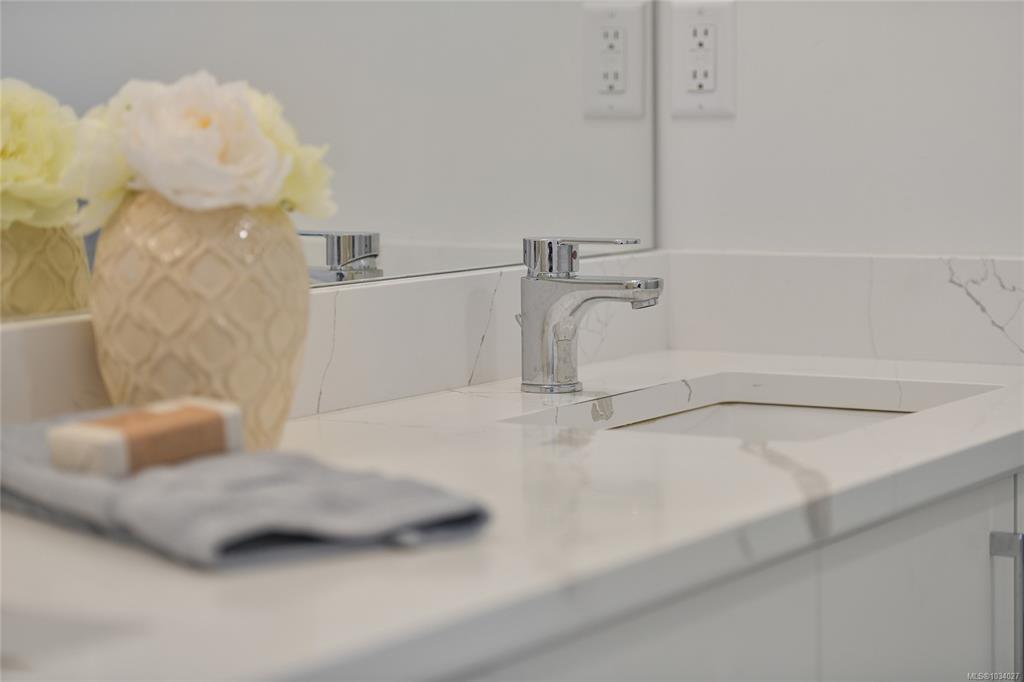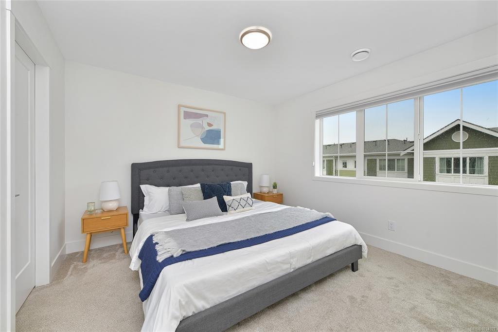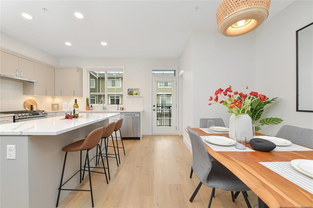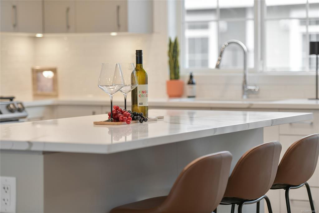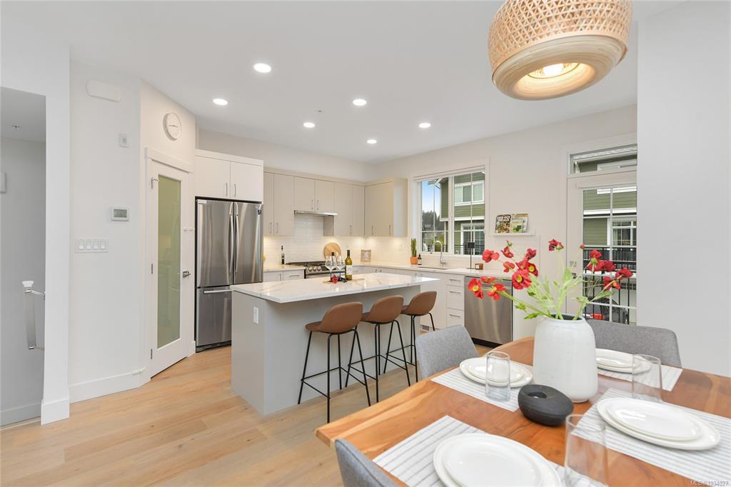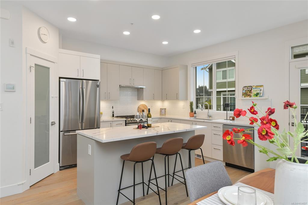 Welcome to Royal Bay, a vibrant seaside community offering the perfect blend of lifestyle and convenience. This bright and spacious home features an open-concept “great room” design with 9-foot ceilings, large picture windows, and sun-filled living and dining areas. The modern kitchen is beautifully appointed with quartz countertops, a center island, undermount sink, tiled backsplash, stainless steel appliances, gas stove, and a walk-in pantry. Upstairs, the primary bedroom includes a custom walk-in closet and a stylish ensuite with quartz counters, tiled flooring, and a glass-framed shower, plus two additional bedrooms. A lower-level office adds flexibility for work or study, along with a double garage. Enjoy low monthly expenses with reasonable strata fees, a high-efficiency natural gas furnace, and tankless hot water. Located just steps to Meadow Park Playground, scenic trails, beaches, and the retail village.
