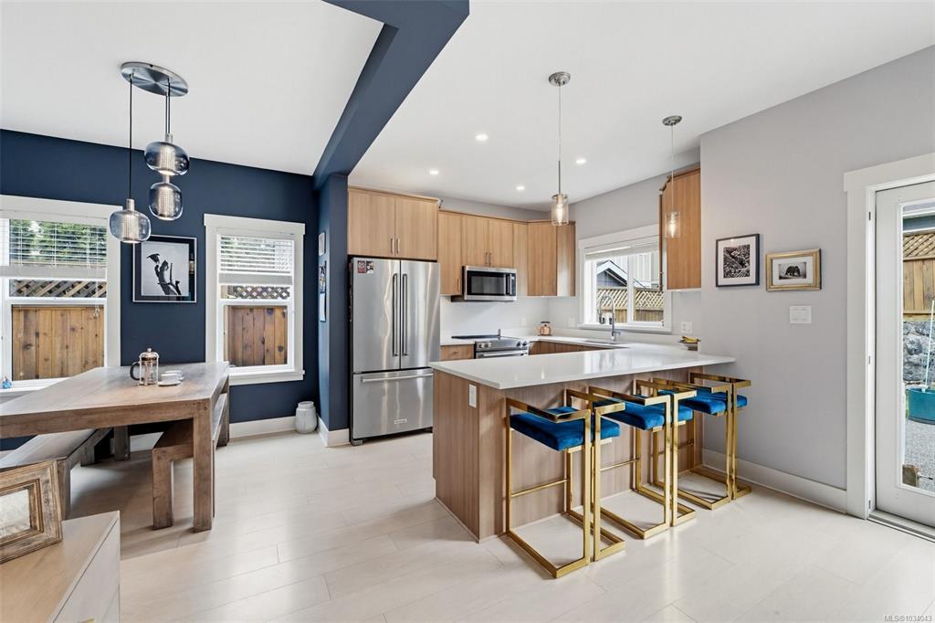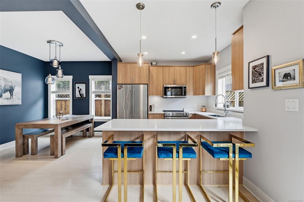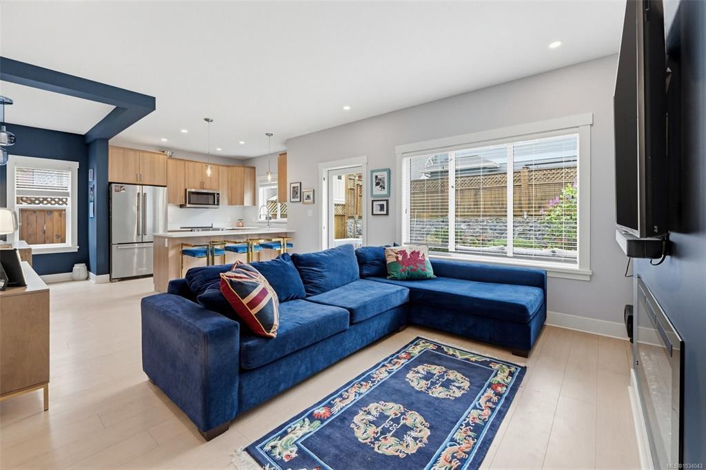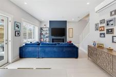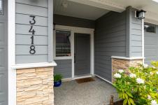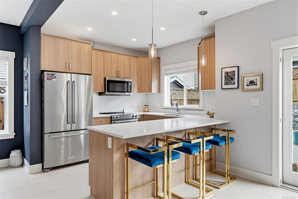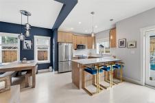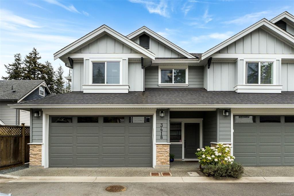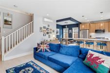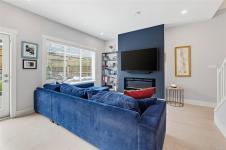 Welcome to this beautifully designed end-unit townhome, offering the feel of a duplex with exceptional privacy and space. This 3-bed, 3-bath home features a double-car garage plus two additional designated parking spaces directly in front of the home. The main level showcases a bright, open-concept layout with 9’ ceilings, a modern fireplace, and a stunning kitchen complete with quartz countertops, stainless steel appliances, soft-close cabinetry, and under-cabinet lighting. Step out to your private, west-facing fenced backyard, perfect for relaxing or entertaining. Upstairs offers 3 spacious bedrooms, including a generous primary suite with walk-in closet and ensuite with double sinks and a walk-in shower, plus a full main bath and convenient upper-level laundry. Equipped with a dual-head ductless heat pump with A/C. Just steps to the NEW Elementary School, close to parks, shopping, and amenities, this is modern West Coast living at its best.