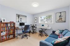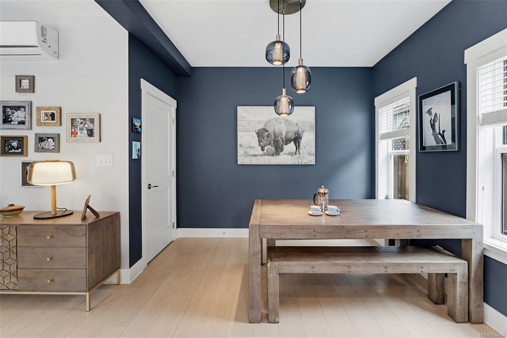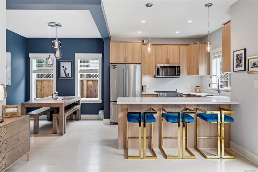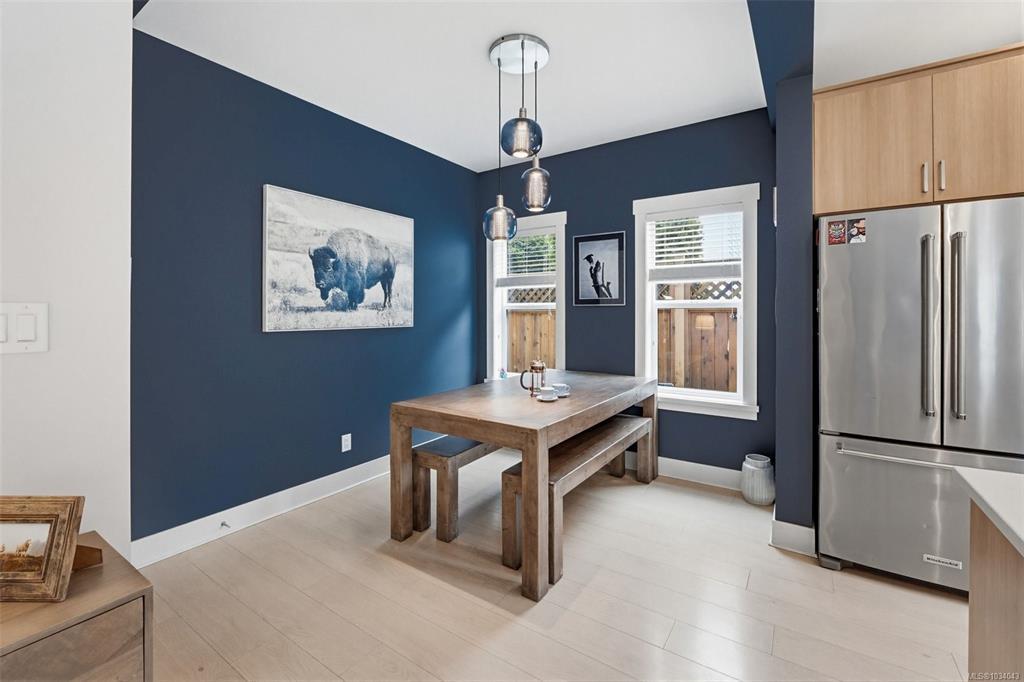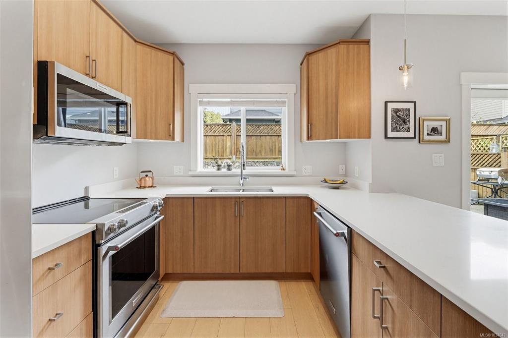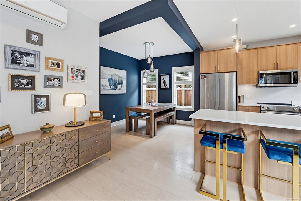 Welcome to this beautifully designed end-unit townhome, offering the feel of a duplex with exceptional privacy and space. This 3-bed, 3-bath home features a double-car garage plus two additional designated parking spaces directly in front of the home. The main level showcases a bright, open-concept layout with 9’ ceilings, a modern fireplace, and a stunning kitchen complete with quartz countertops, stainless steel appliances, soft-close cabinetry, and under-cabinet lighting. Step out to your private, west-facing fenced backyard, perfect for relaxing or entertaining. Upstairs offers 3 spacious bedrooms, including a generous primary suite with walk-in closet and ensuite with double sinks and a walk-in shower, plus a full main bath and convenient upper-level laundry. Equipped with a dual-head ductless heat pump with A/C. Just steps to the NEW Elementary School, close to parks, shopping, and amenities, this is modern West Coast living at its best.